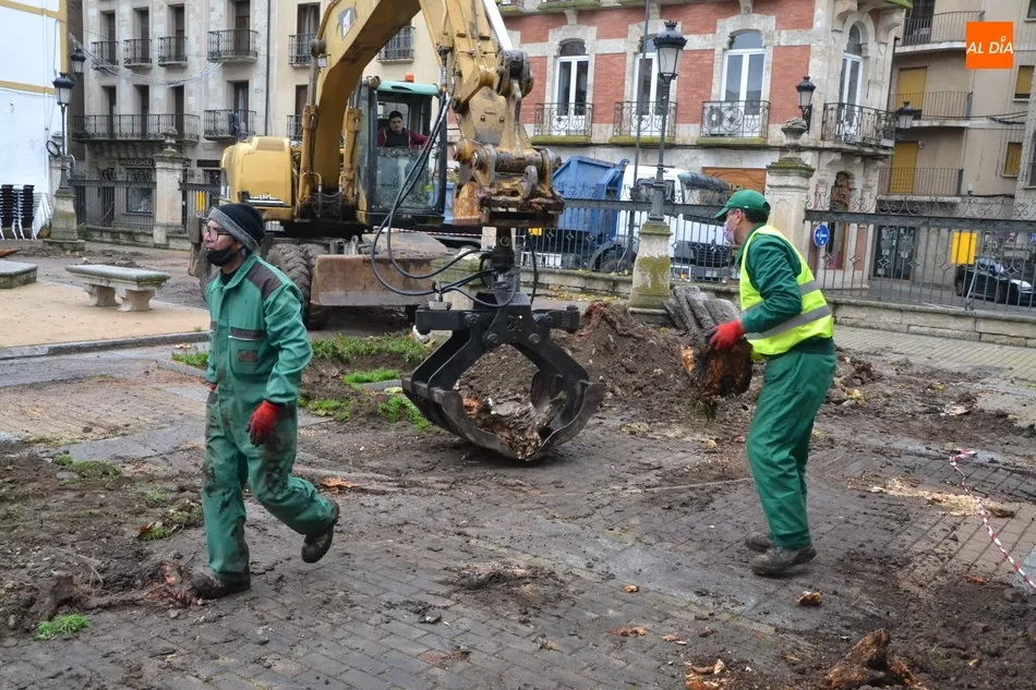 Durante toda la mañana del jueves continuó la intensa actividad en la Plazuela del Buen Alcalde de Ciudad Rodrigo para sustituir los históricos árboles del lugar, que han finalizado su vida en el recinto amurallado mirobrigense (donde han permanecido al menos 75 años) ante el deteriorado estado que ya presentaban, lo que había obligado incluso a rellenar algunos con espuma para que mantuviesen la estructura.