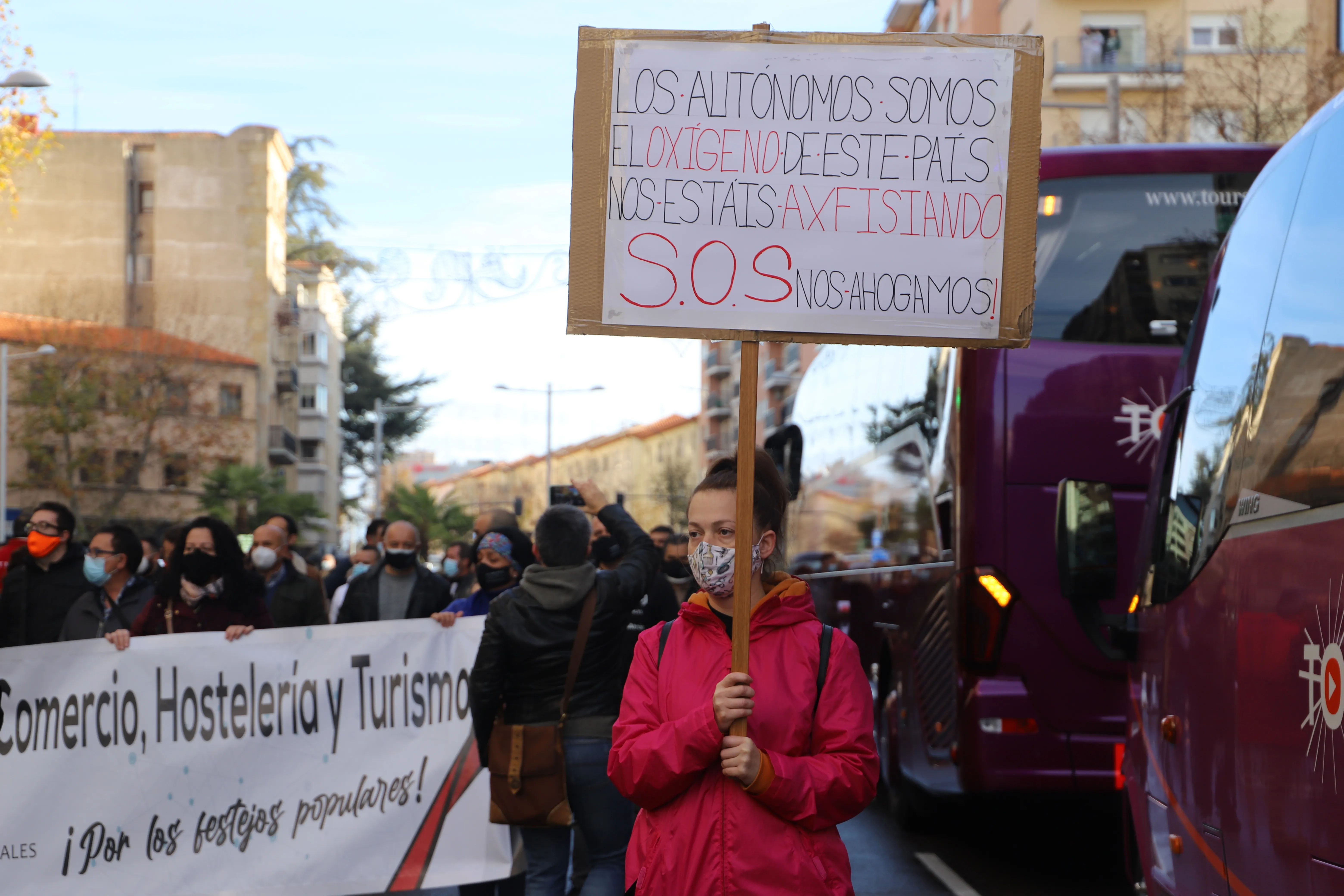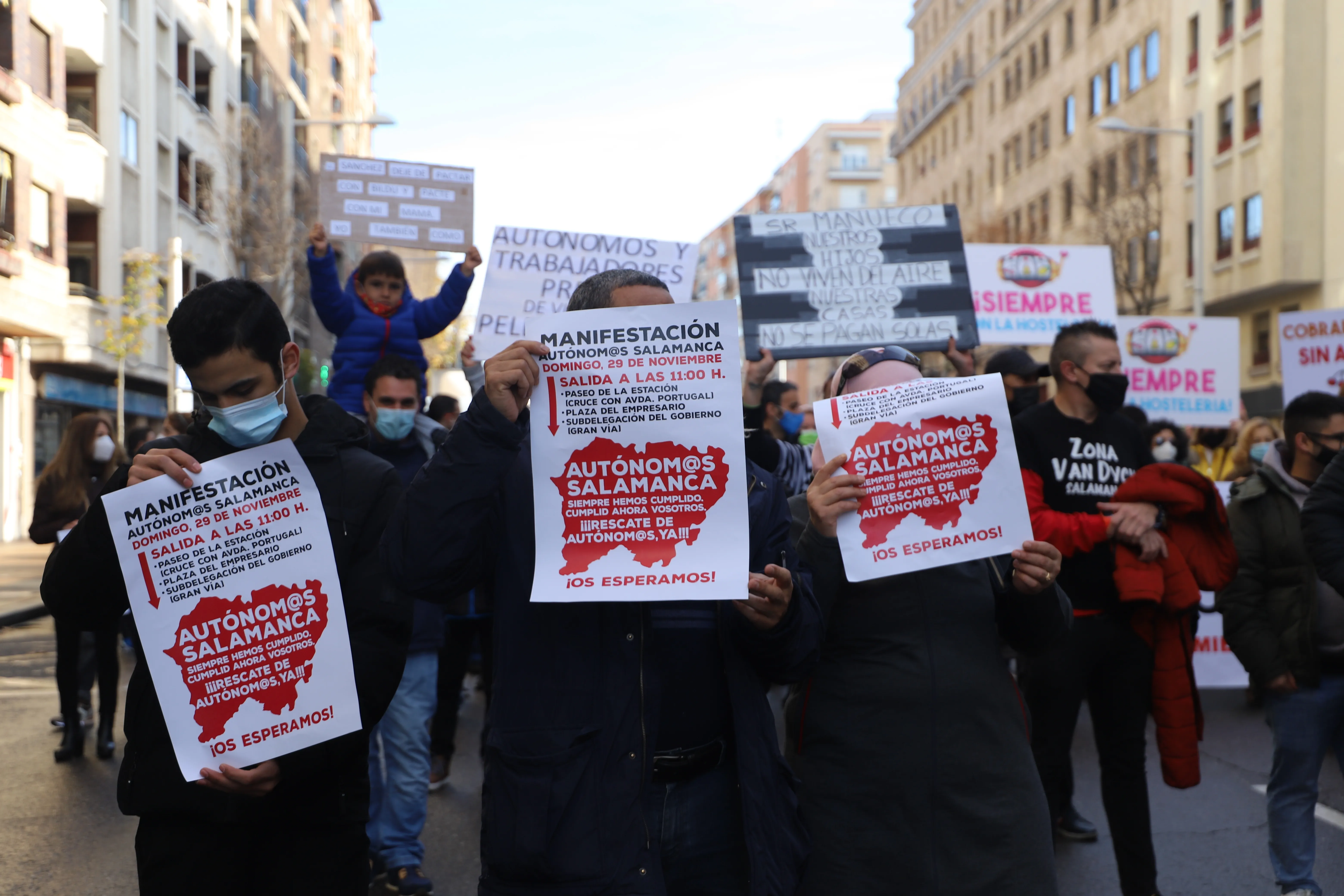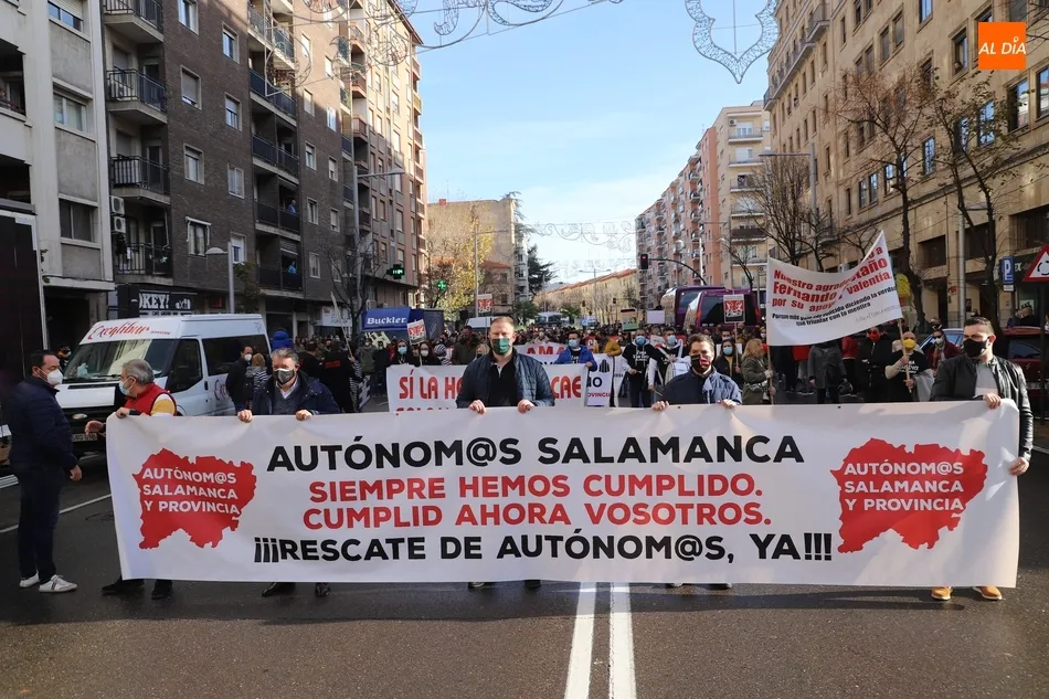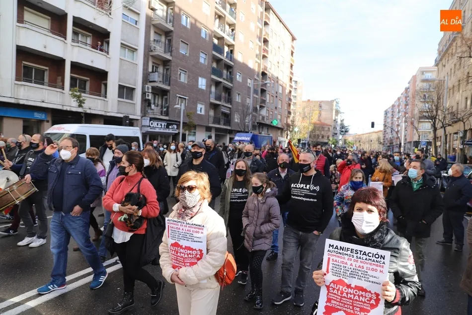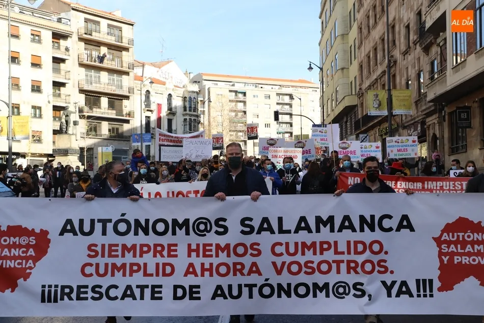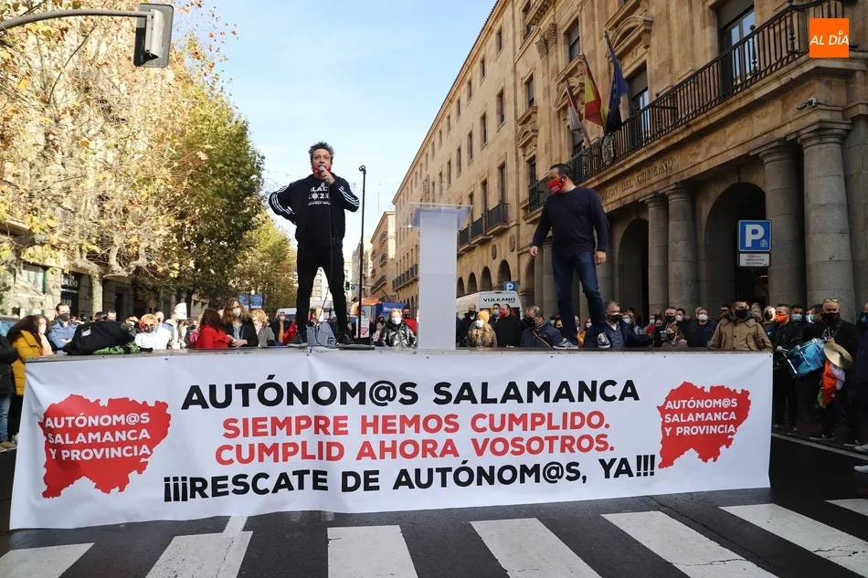 El centro de Salamanca se ha llenado esta mañana con cerca de un millar de autónomos que han clamado contra el Gobierno y han solicitado ayudas por la grave crisis económica que sufren por culpa de la pandemia. Con lemas como ?Necesitamos trabajar? reclamaban ayudas a los negocios ante el cierre obligatorio y la exención de la cuota de autónomo por ese motivo. También reclamaban cubrir el cien por cien de los procesos de ERTE, equiparar la cuota a la media europea, derecho a la prestación por desempleo en caso de enfermedad o quiebra, que el ERTE no cotice por desempleo y la reducción del IVA.