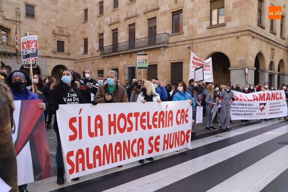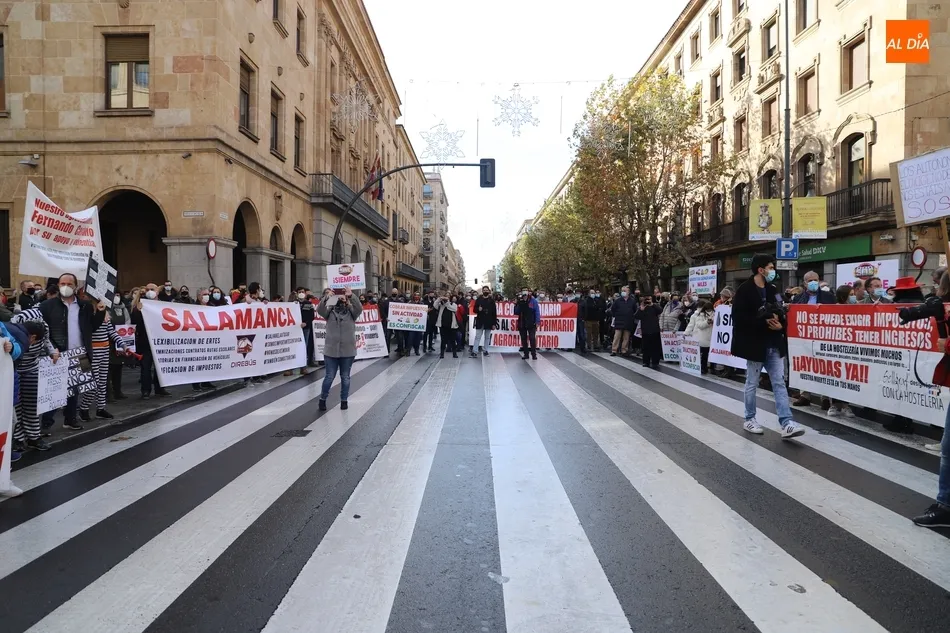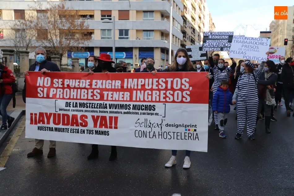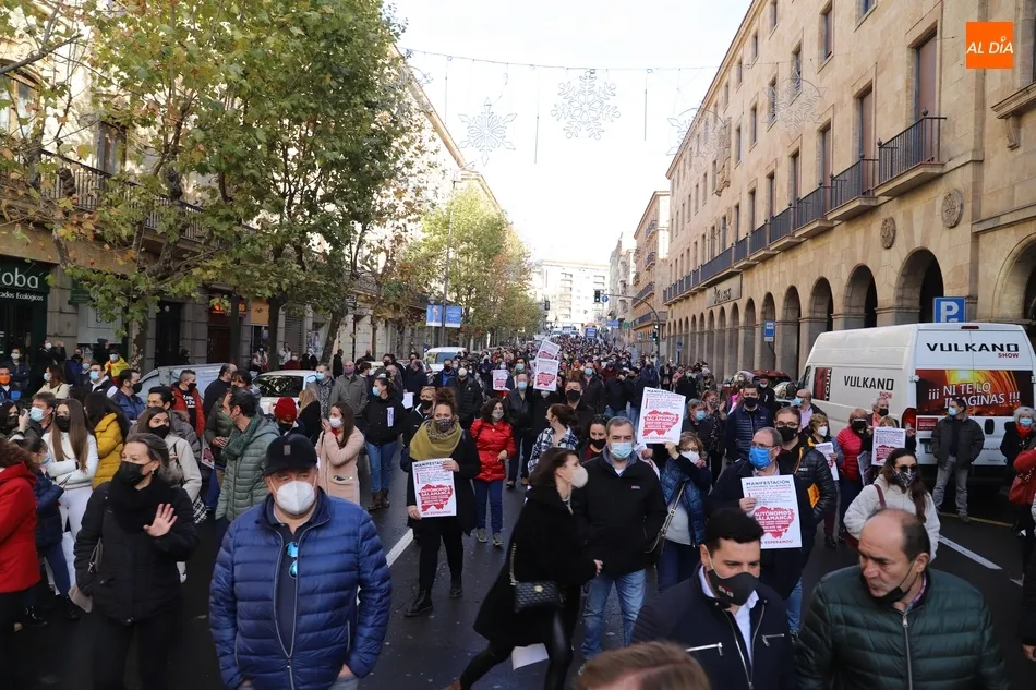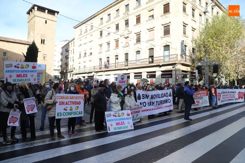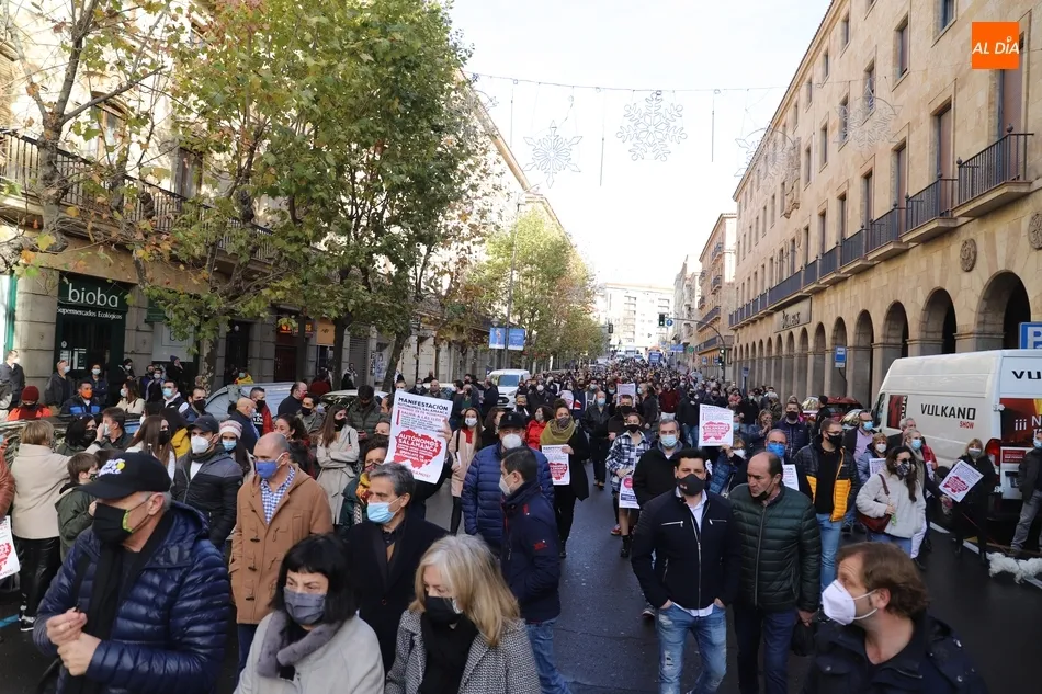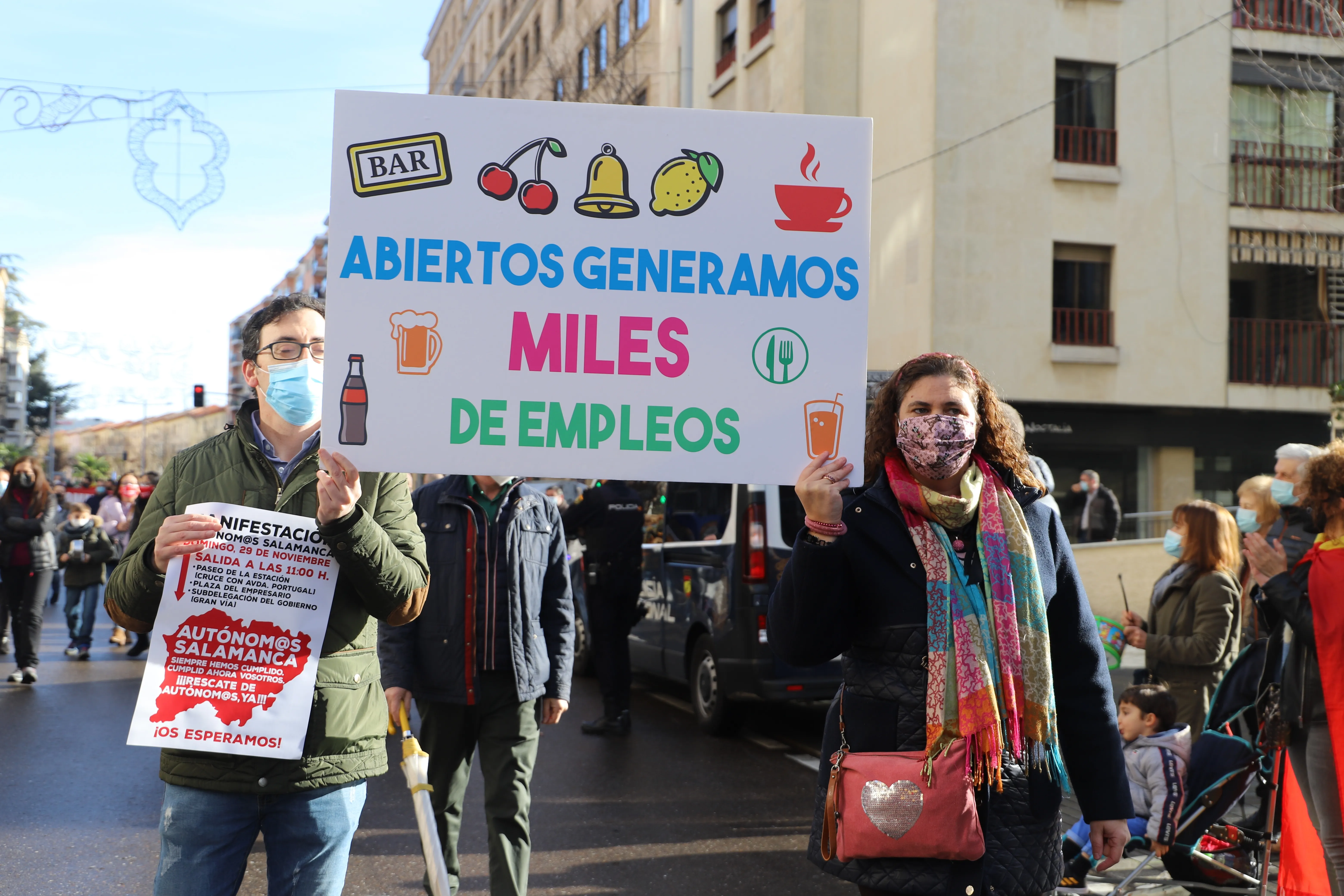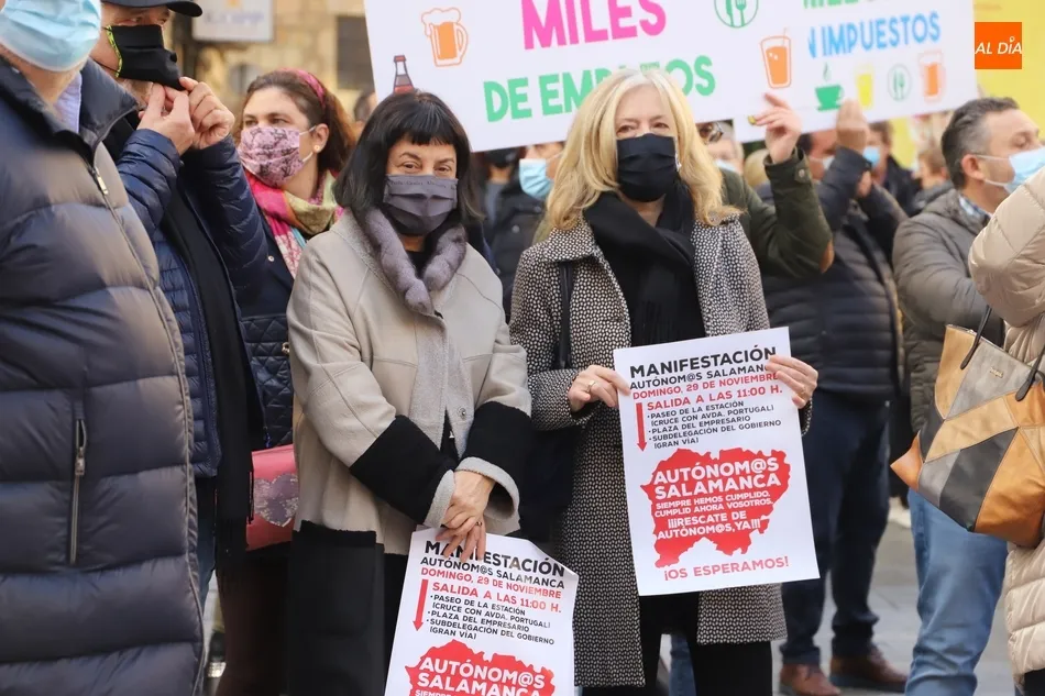El centro de Salamanca se ha llenado esta mañana con cerca de un millar de autónomos que han clamado contra el Gobierno y han solicitado ayudas por la grave crisis económica que sufren por culpa de la pandemia. Con lemas como ?Necesitamos trabajar? reclamaban ayudas a los negocios ante el cierre obligatorio y la exención de la cuota de autónomo por ese motivo. También reclamaban cubrir el cien por cien de los procesos de ERTE, equiparar la cuota a la media europea, derecho a la prestación por desempleo en caso de enfermedad o quiebra, que el ERTE no cotice por desempleo y la reducción del IVA.