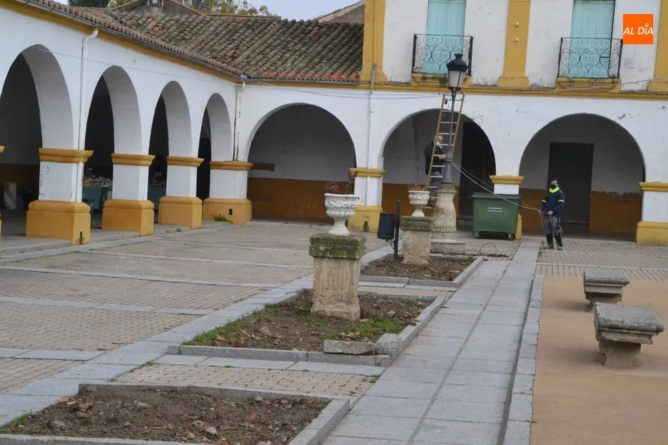 En la mañana del martes, en la que fue protagonista la niebla en Ciudad Rodrigo, hubo movimiento adicional por la Plazuela ya que se estuvieron colocando distintos elementos de alumbrado navideño, en este caso uniendo varias farolas y soportales del lugar (otros años había tiras de leds enredadas en la parte superior de los árboles).
