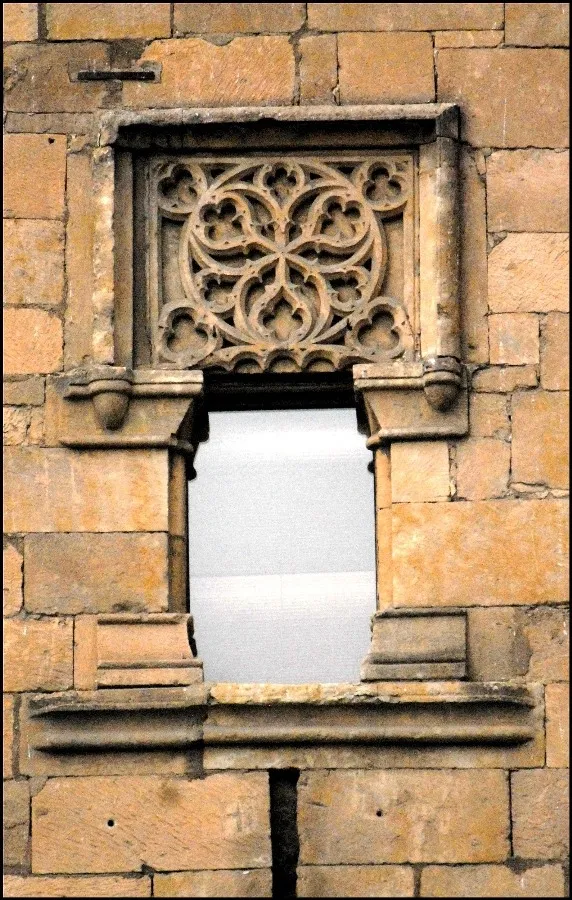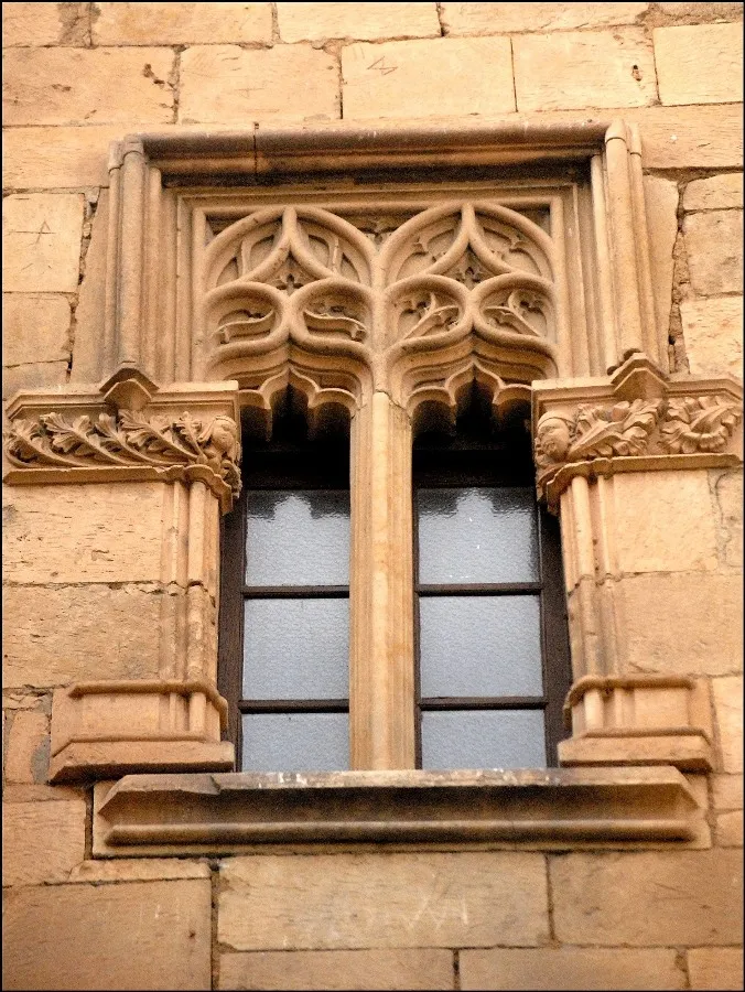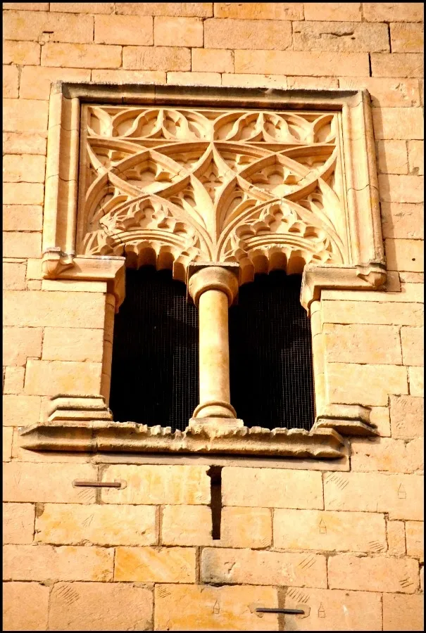Ventanas góticas, aljimezes exquisitos con trazos de piedra circulares de bella factura, mozárabe, morisco trazado de compás de piedra. Aljimez es la ventana de dos aberturas separadas por una delicada columna llamada mainel o parteluz. Ventana de arco ojival de geométricos adornos árabes, arcos lobulados, finas columnas, herradura mora en la casa de los Fermoselle. Es la conjunción del gótico con el arte mozárabe en tierras de guerreros y damas asomadas al aire de su ventana, al hermoso espacio de su bordado de piedra, bellos arabesco. Hay que admirarse ante estas bellas ventanas que el fotógrafo recrea, una a una, deleitándose en su trazo de calígrafía mora. Es el extraño encuentro de formas de arte que contrastan, en su elevada fuerza, con la torre rectangular que se eleva al cielo, la más hermosamente llamada en esta Salamanca de sugerente toponimia y callejero prodigioso.
