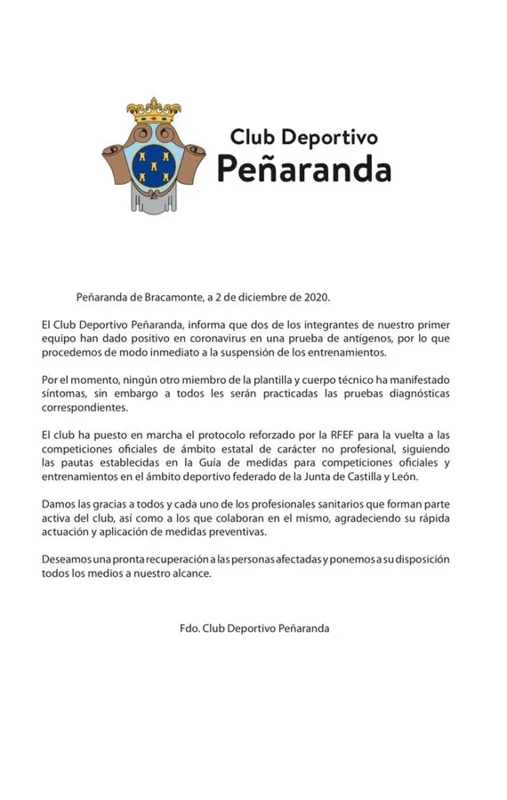 El Peñaranda notificó dos positivos en coronavirus y la suspensión de los entrenamientos tras lo ocurrido. El club salmantino comunicó que conocieron el resultado mediante los test de antígenos. Además, la entidad morada también comenta que nadie más de la plantilla y el cuerpo técnico presentan síntomas, mientras que ya han activado todos los protocolos sanitarios.