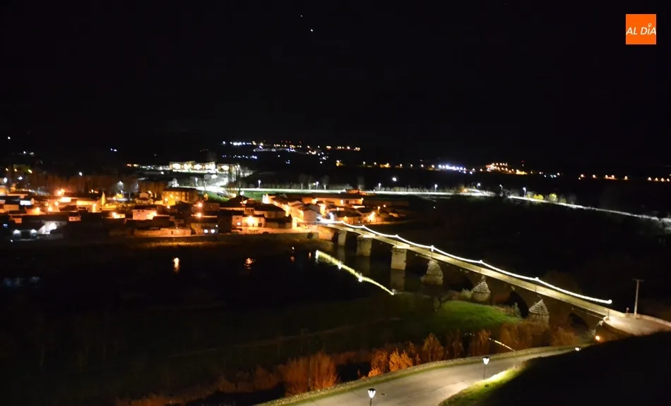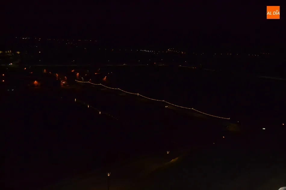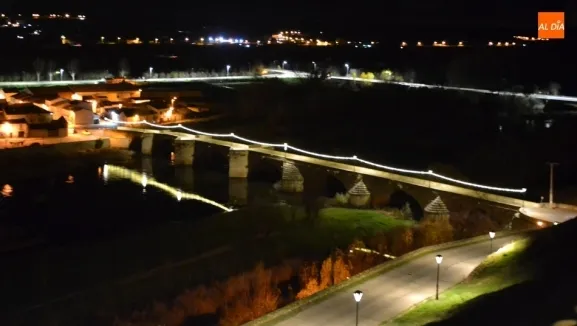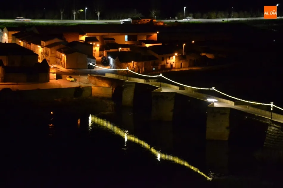 La ornamentación de Ciudad Rodrigo con alumbrado para vivir de una forma más especial la Navidad ha llegado en este 2020 como novedad hasta el histórico Puente Mayor. Como se puede entender mejor viendo las imágenes que acompañan estas líneas, se ha colocado una hilera de luces enganchada en las farolas con las que cuenta el Puente, ubicadas en el lateral más cercano a la presa de La Pesquera. Al reflejarse en las aguas del Águeda, estas luces son ?dobles?, al menos desde ciertas perspectivas, como por ejemplo la que se puede observar desde la Batería de la Muralla.