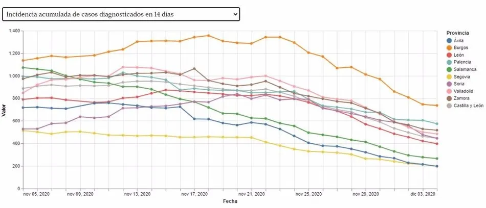 Así lo muestra la estadística que ofrece la Junta de Castilla y León en la web de Datos Abiertos, donde se refleja un acusado descenso de más de 250 casos por cada 100.000 habitantes en una semana, de los 700 del pasado viernes 26 a 445 de este viernes, 4 de diciembre.