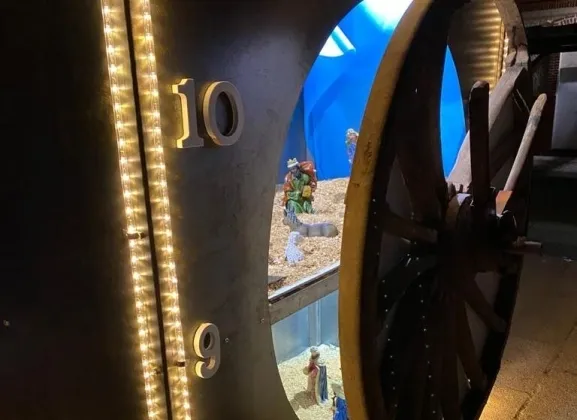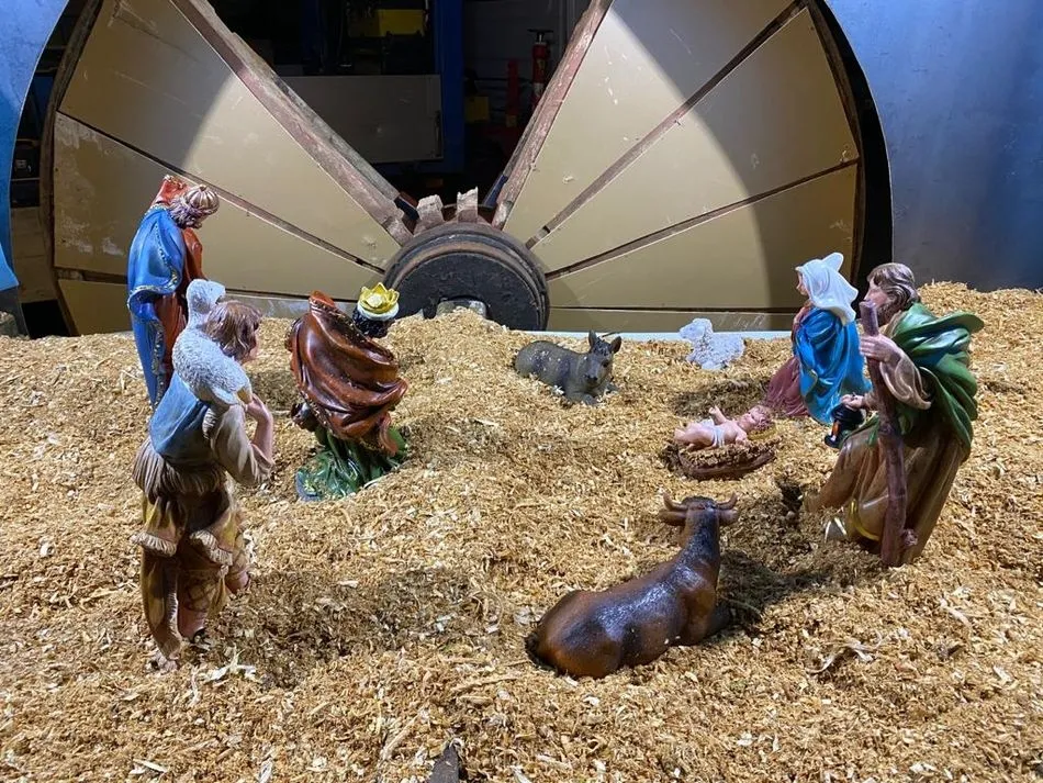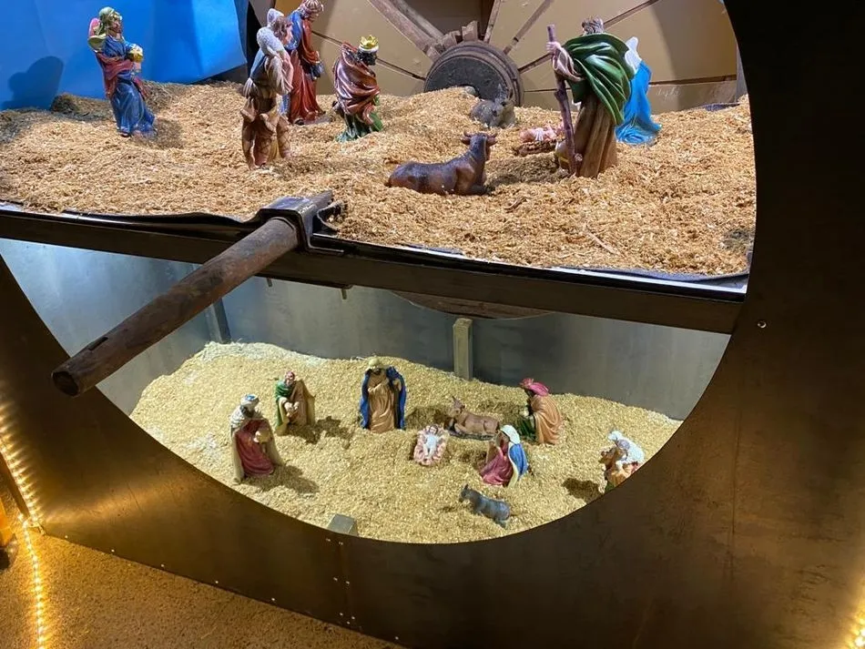 Fabricado con dos ruedas de carro, de cuyo eje parten las agujas de un reloj, su interior alberga dos pisos. En el primero se encuentra el pasaje del nacimiento del niño Jesús, mientras que en la planta baja puede contemplarse la Adoración de los Reyes Magos.