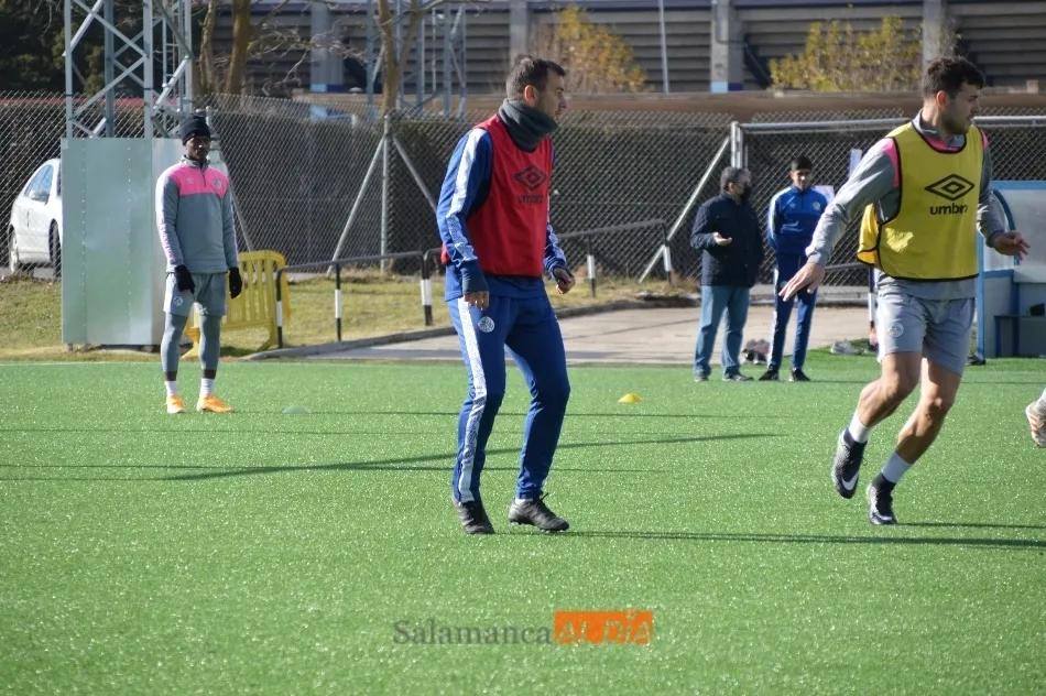 Posteriormente, los rondos a dos toques con dos jugadores intentando robar el balón en el medio tuvieron el protagonismo y todas las miradas antes de disputar un partido en espacios reducidos con varios apoyos, lo que dio lugar a que Álvaro Tejedor, exjugador del Salamanca UDS y actual miembro del cuerpo técnico, tuviera que ponerse el peto para llevar a cabo la práctica.