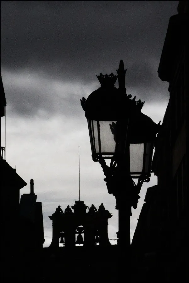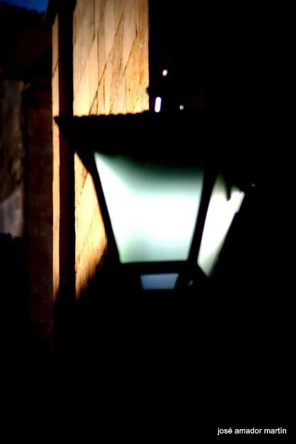 El hilo de la modernidad ilumina el interior de la hermosa farola de hierro, salida quizás de la forja de los Moneo como tantas cosas en esta Salamanca de luces y sombras. Suya es la luz de toda luz, luciérnaga diaria que nos acompaña en los inviernos que anochecen temprano, en los veranos que incitan al paseo. Recortada contra el cielo, el fotógrafo la descubre con silueta de reina coronada, broche exquisito de la pared de piedra. Es el adorno del muro, es el puntal de la Plaza en su vacío bellísimo de soportales y geometrías barrocas. Y mientras Amador Martín la convierte en sombra que ilumina, se hace la luz y se doran de nuevo las piedras de una ciudad siempre al abrigo de todas las oscuridades. Porque la belleza ilumina, y de eso mucho sabe aquel que nos la devuelve retratada.