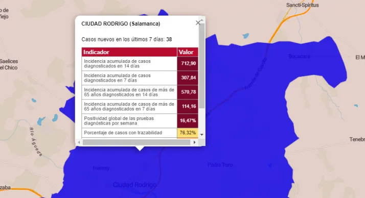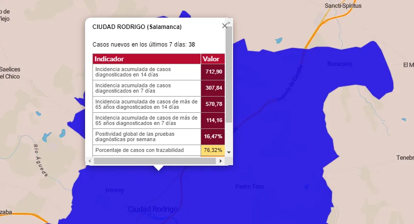 En lo que respecta a los datos numéricos de incidencia en Ciudad Rodrigo, hay cambios en direcciones opuestas. Por un lado, en lo que se refiere a la incidencia de los últimos 14 días, sube de 696 a 712 casos por cada 100.000 habitantes; mientras que por otro lado, la incidencia de la última semana baja ligeramente, de 324 a 307 casos por cada 100.000 habitantes, ya que la cifra absoluta de casos detectados en los 7 días previos baja de 40 a 38 respecto al viernes.