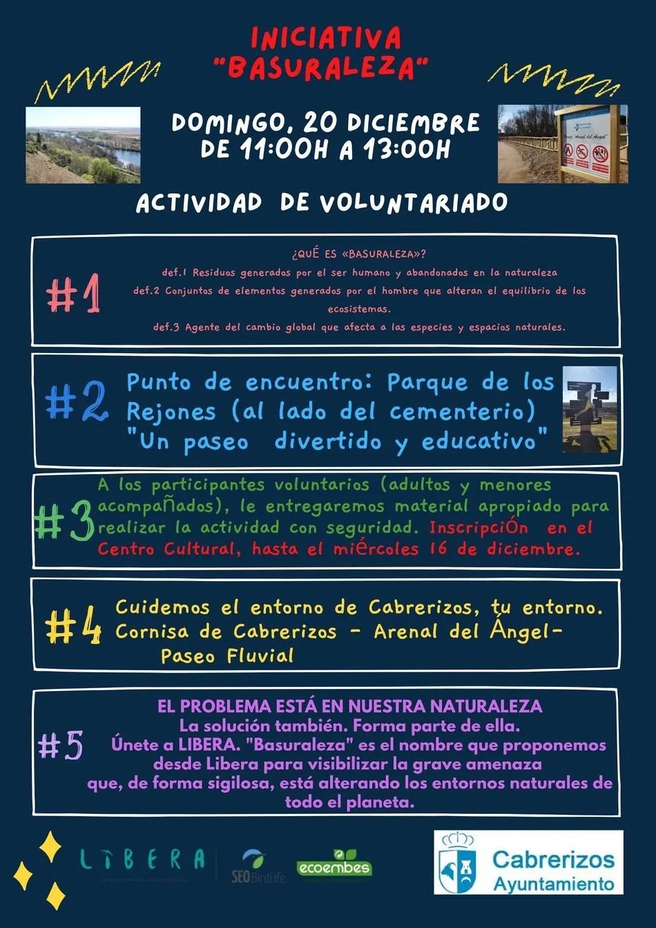 ?Basuraleza. Cuidamos nuestro entorno, tu entorno?. Es el título de la actividad educativa de voluntariado y sensibilización que organiza Cabrerizos este domingo, día 20 de diciembre. Actividad que consistirá en la recogida de basura en nuestros parques y entorno natural de Cabrerizos, y la que se sumarán juegos para los más pequeños. Un paseo limpio y seguro.