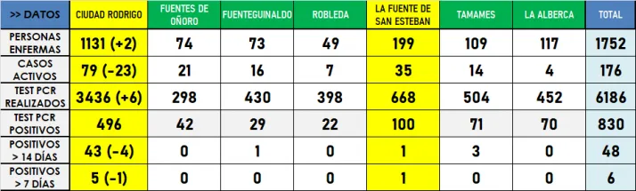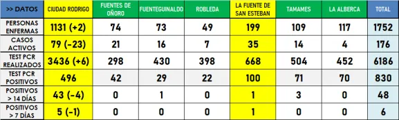 La tabla por municipios tiene como única otra variación que El Maíllo deja de estar en riesgo ?Muy Alto? en lo que a la incidencia de los últimos 14 días se refiere, entrando ya en la ?Nueva Normalidad?. Todos los municipios de la comarca están ya en esa situación salvo Ciudad Rodrigo y Dios le Guarde, que mantienen el riesgo ?Muy Alto? tanto a 7 como a 14 días.