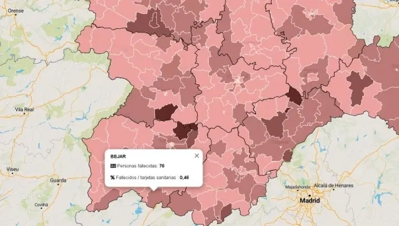 La mortalidad por COVID-19 en la ZBS de Béjar se sube a 76, cuatro personas fallecidas más en la última semana confirmadas por la enfermedad, el 0,46 % de las tarjetas sanitarias. La cifra global asciende a 247, diez muertos en los últimos siete días, corresponden al 1,51 % de las tarjetas sanitarias registradas en la zona de salud de Béjar. La cifra de 247 fallecidos es un dato global de mortalidad, según los datos oficiales, no vinculados exclusivamente a enfermedad por COVID-19. El cálculo se ha realizado tomando en cuenta las bajas de tarjetas sanitarias, esta tasa se calcula con respecto a la población de cada provincia expresada por mil.