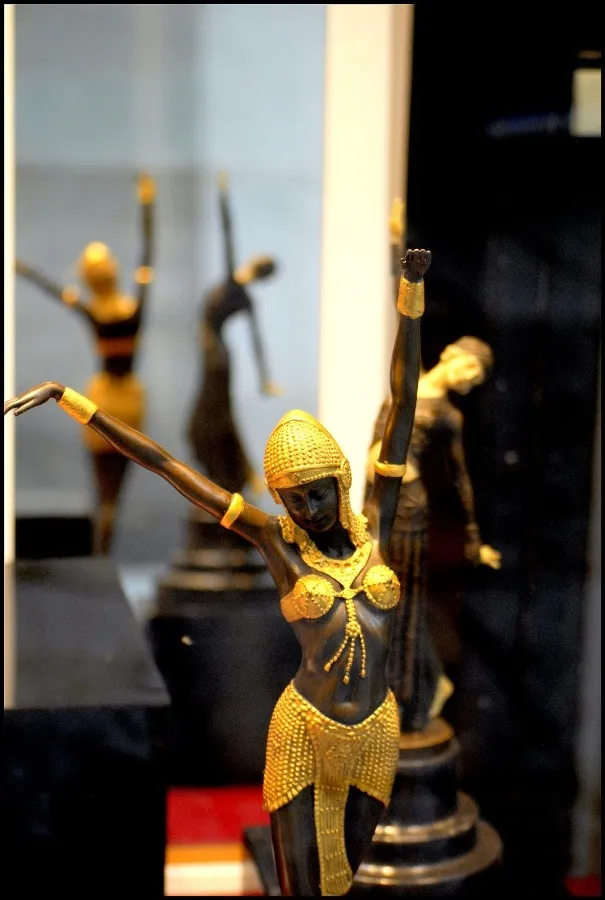 Y tiene también el fotógrafo querencia por aquella que escribe sus paseos por una Salamanca comercial que tanta belleza atesora en sus pupilas fijas de escaparates. Y porque me la tiene y demuestra, se detiene en la calle Prior, el pasillo estrecho que nos prepara para la grandeza de la Plaza, para regalarme la mirada de Lis, vuelo de bailarinas al son del jazz de los años 20 y 30. Amador Martín sabe de mi amor de criselefantina, de mi deseo de equilibrio y ligereza? y su objetivo se apresta a captar el movimiento que, sobre la peana de mármol u ónice, despliega la criselefantina escapada de la Casa Lis, Museo Art Déco y Art Nouveau para bailar sobre los mortales que quieren llevarse a casa una réplica magnífica de su danza.