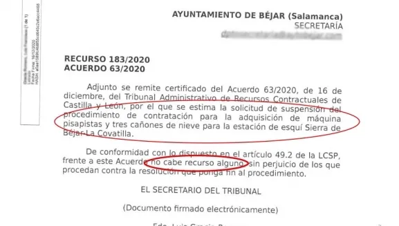 TAB ha puesto en conocimiento de la ciudadanía que el Ayuntamiento de Béjar había tenido conocimiento del acuerdo del Tribunal de Recursos Contractuales de Castilla y León, dependiente del Consejo Consultivo, en el que se suspende sin opción a recurso el contrato para la adquisición de dos lotes que se pretendían adjudicar por importe de 615.595,97 euros. El primero de ellos correspondiente a una máquina pisa-pistas, estaba prevista su adjudicación en 459.800 ? y el segundo lote correspondiente a los tres cañones de nieve valorados en 155.797,97 ?. El importe total se iba a pagar con parte de los fondos del Plan de Reindustrialización que Junta de Castilla y León destinó para La Covatilla.