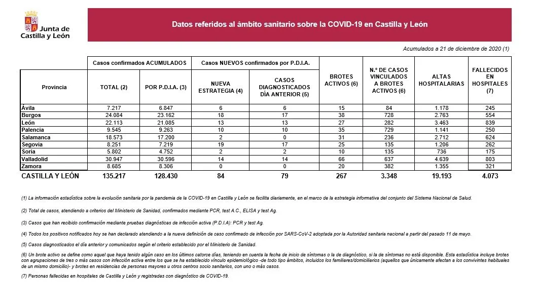 Aclarar que hoy, 21 de diciembre, han entrado en el Sistema de Información de vigilancia Epidemiológica (SIVE) casos confirmados de infección activa de COVID-19 antiguos, bien de la notificación de laboratorios privados o bien pendientes de validación en SIVE. Estos casos no se han incluido como casos nuevos de hoy pero sí se han adjudicado a su fecha de diagnóstico. Por ello, el total acumulado de hoy no es la suma del total acumulado de ayer más los casos nuevos de hoy.