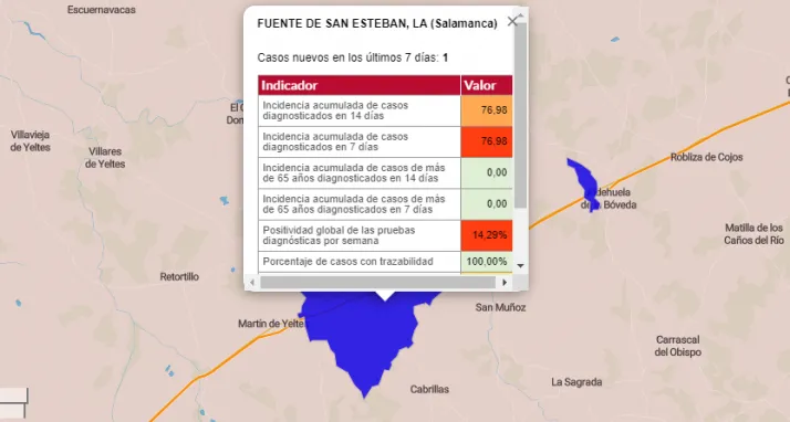 Algo parecido ocurre en el municipio de Fuenteguinaldo, donde sin aparecer el número concreto de nuevos positivos, sí figura que la localidad entra en riesgo ?Muy Alto? en lo que a los últimos 7 días se refiere, y en riesgo ?Alto? en el global de las dos últimas semanas. De este modo, ya son dos localidades (la otra es Gallegos de Argañán) en riesgo ?Muy Alto?.