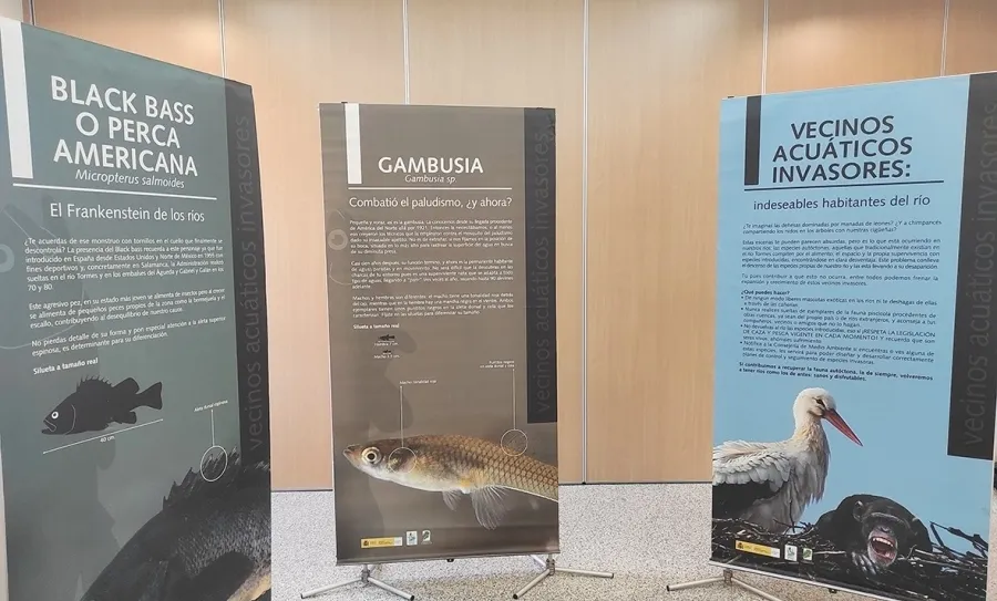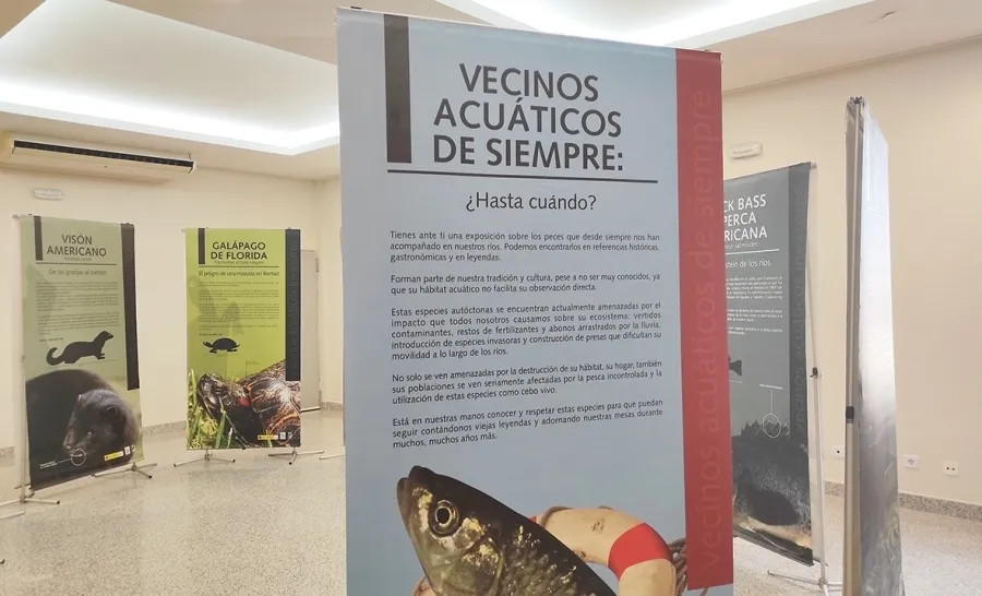 Además, en la exposición hay una parte dedicada a los animales acuáticos invasores. Un problema acuciante en nuestros ríos es la introducción de especies depredadoras alóctonas. Estas especies ejercen una fuerte presión depredadora sobre las autóctonas, que se ven desplazadas o incluso llegan a desparecer de ciertos tramos, afluentes y lagunas.