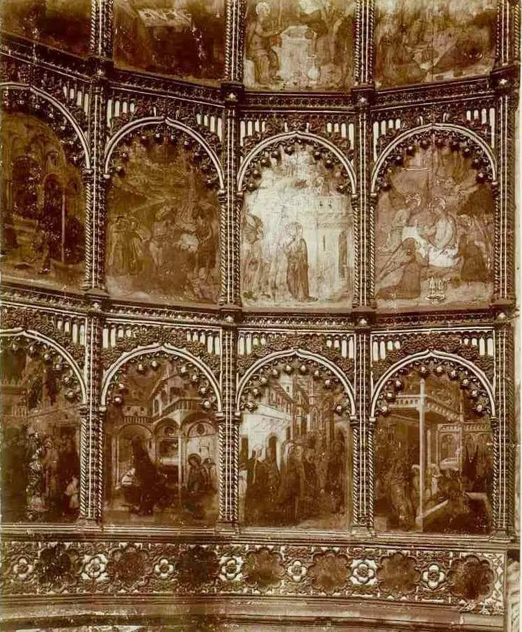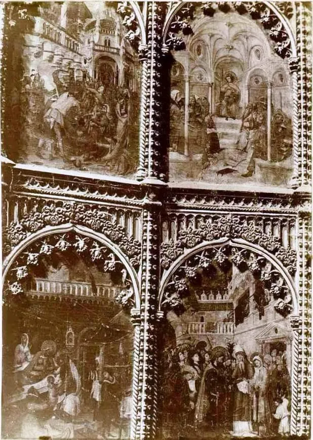 Son tres los autores que trabajaron en las 53 tablas que componen el retablo mayor, coronado con una pintura al fresco sobre el Juicio Final, presidida por Jesucristo, rodeado de ángeles portadores de símbolos de