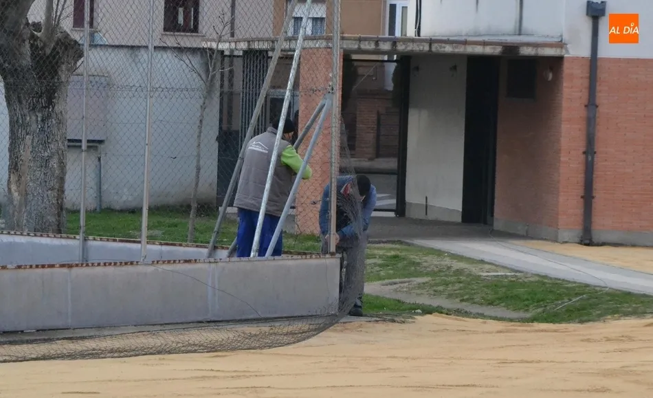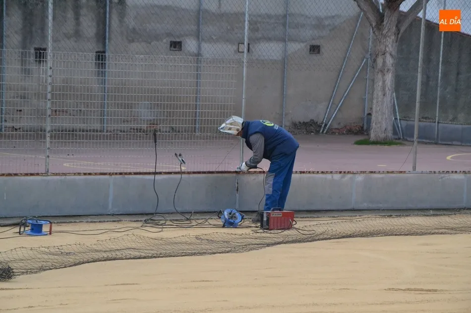 Esta actuación de adecentamiento del patio se ha hecho, en palabras de Marcos Iglesias, ?en tiempo récord? durante el período navideño de vacaciones, ya que incluso las festividades han caído en mitad de la semana reduciéndose el número de días laborables. Junto a la extensión del filler, durante estos días se ha procedido (todavía se estaba rematando en la mañana del viernes) a sustituir la malla metálica que rodea la pista de fútbol sala del patio, que estaba en malas condiciones.