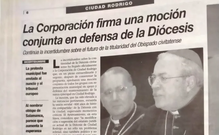 Entre esos esfuerzos estuvo la moción conjunta en el Ayuntamiento, aprobada en un pleno ?extraordinario y urgente? en el que se expusieron todos los argumentos para reclamar la continuidad de la Diócesis. Aquella moción fue trasladada a las instancias competentes ?al tiempo que se iniciaban otro tipo de gestiones? para preservar la Diócesis, lográndose que ?apenas dos meses después, sin duda fruto de ese compromiso institucional y social con nuestro territorio eclesiástico?, la Nunciatura de la Santa Sede en España nombrase un nuevo prelado.