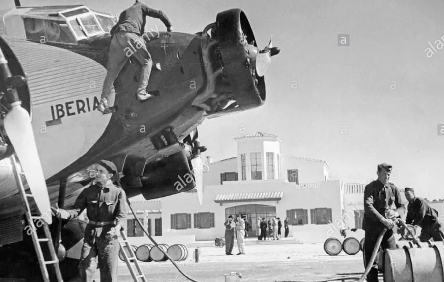 En este sentido, añado que, ?aunque las líneas fuesen competencia de la Lufthansa, se realizaban con aviones de la compañía Iberia, como este Junker-52, que vemos repostando en Matacán (foto inferior del fondo Alamy)?.