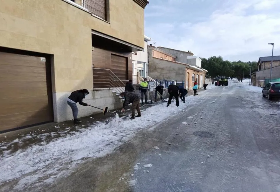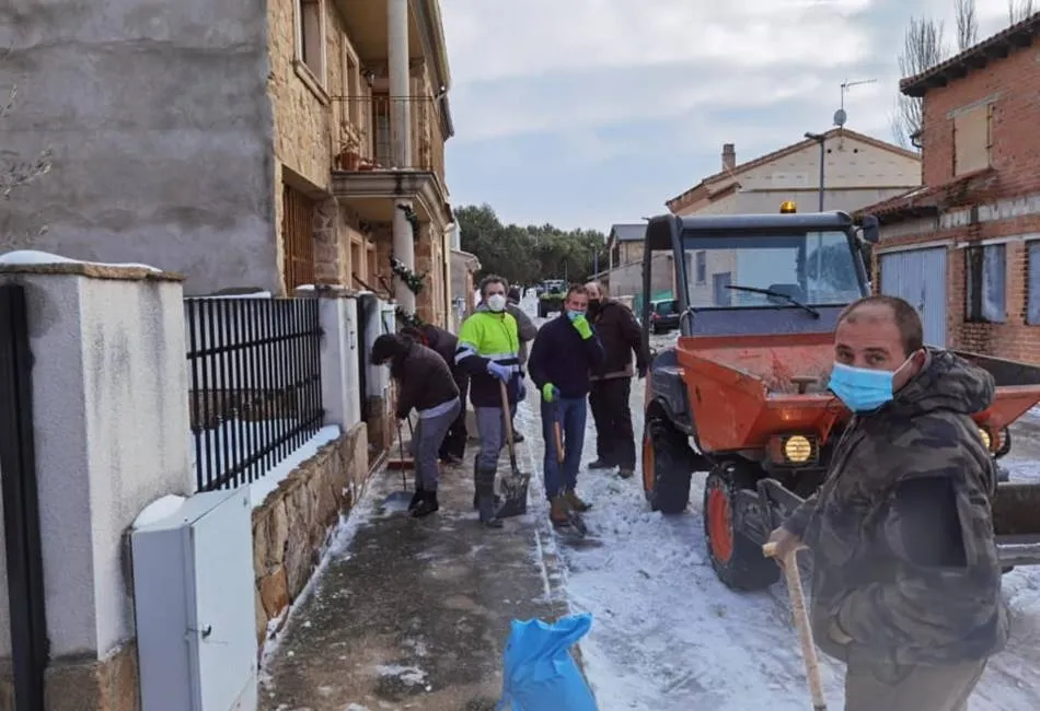 La jornada de ayer en los pueblos estuvo marcada por el trabajo en equipo de numerosas personas para facilitar el acceso a viviendas y la circulación. Los vecinos de las localidades son conscientes del peligro que entraña la helada tras la nevada, y más tras la abundante precipitación en forma de copos que ha cubierto los campos. Por esta razón ayer salieron a las calles tractores con palas, máquinas retroexcavadoras, cuchillas y otra maquinaria. Hombres y mujeres dedicaron su domingo a unirse y trabajar por la comunidad. Se encargaron de ayudar a quien lo pudiera necesitar y de retirar en la medida de lo posible la abundancia de nieve depositada sobre todo en las entradas de vivienda y zonas de paso principales.