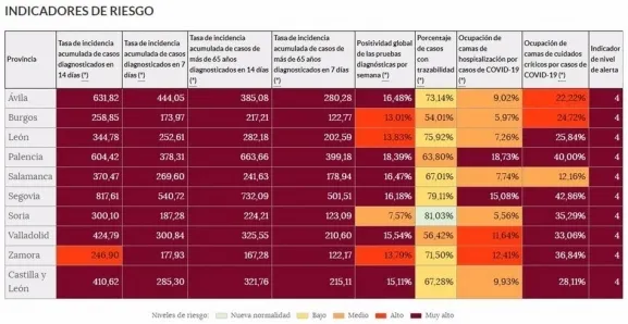 Con ello, y ya con los valores recogidos en el portal de datos sobre la situación epidemiológica por el coronavirus, todas las provincias de la Comunidad han entrado ya en el nivel de riesgo "muy alto" del denominado semáforo COVID, en el que el pasado jueves solo estaban Ávila, Palencia y Segovia, donde se adoptaron medidas adicionales desde este domingo que implican el cierre al público del interior de los locales de hostelería, las grandes superficies comerciales, los gimnasios y centros deportivos cubiertos y las casas de apuestas y salones de juego.