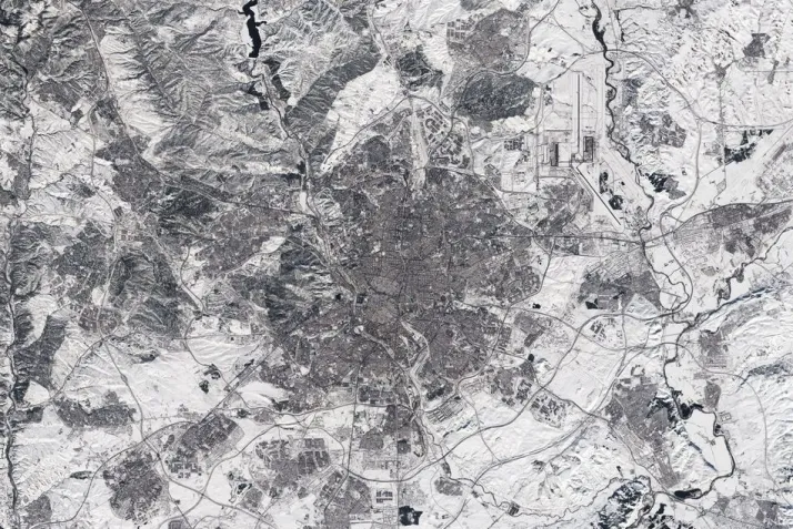 Captada el 11 de enero, esta imagen de Madrid parece haber sido tomada en blanco y negro, pero es una imagen en color real debido a la nevada más intensa en 50 años