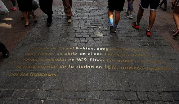 Sin embargo, esa inscripción en pleno corazón de Madrid (que aparece en la imagen superior), ha desaparecido en los últimos meses, producto de unas obras en la vía. En concreto, han sido retiradas las antiguas losetas de la calzada y se han colocado nuevos adoquines (como se puede apreciar en el tweet que aparece bajo estas líneas), provocando que Ciudad Rodrigo se quede sin una de sus señas de identidad en una de las vías más transitadas de la capital, ya que, aunque tiene poca longitud, conecta el ágora madrileña con el popular Mercado de San Miguel.