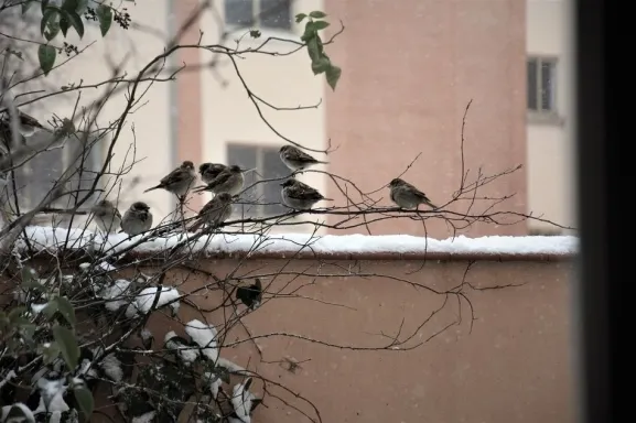 Mis niños pájaros, mi tropel de gorriones, dejan en la nieve apenas helada una escritura casi cuneiforme. Son sus huellas triangulares, sus incisiones sobre la tablilla blanca. Hoy vienen en bandada a buscar comida a la puerta de la cocina y si me descuido, llaman educadamente como heraldos de una religión proselitista. Hola, vengo a por las migajas que le sobran ¿No quiere oír la palabra del rey de los cielos? Yo les pondría primer y segundo plato y postre, porque nada me gusta más que verlos balancearse en el arbusto que trajeron de la nada, semilla alada y sentirlos cerca, dando saltitos más allá de mi ventana. Son humildes, silenciosos, fieles y su presencia diminuta me consuela de todos los males. Viven, van, vienen y dan de comer a sus crías cuando toca y hasta de vez en cuando discuten y se roban la comida al menor de los descuidos. Yo de la corneja, grande y elegantemente vestida, les tendría cierto miedo, lo suyo es la masa compacta de plumón. Son el ejército marrón de este rincón en el que duermen al abrigo de las macetas.