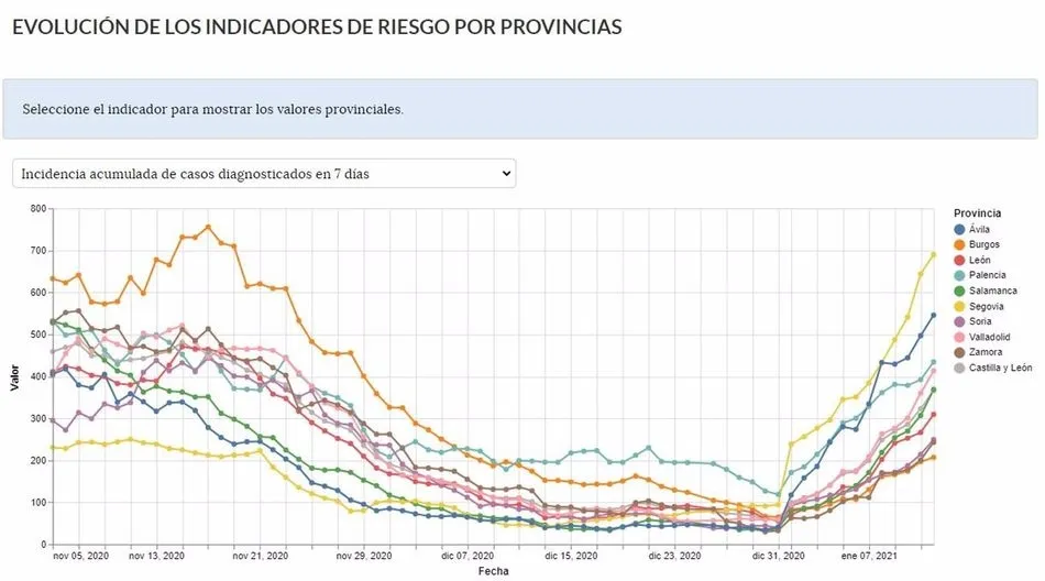 De hecho, Segovia que es actualmente la provincia con peores datos de la Comunidad, ya duplica holgadamente su máximo de noviembre en IA a 7 días, mientras que en el indicador a 14 días ha superado los 1.000 casos por cada 100.000 habitantes -1.037-, lo que quiere decir que en las dos últimas semanas se ha contagiado del coronavirus más de uno de cada 100 segovianos.