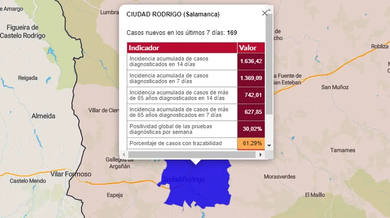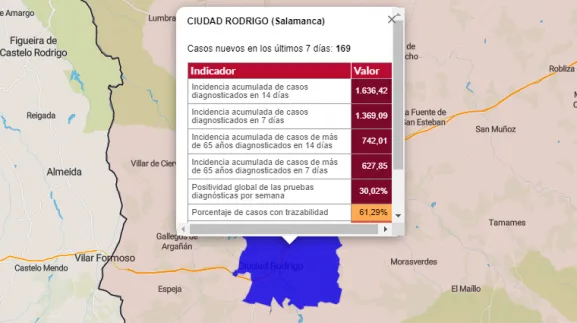 Como es habitual, los datos del municipio de Ciudad Rodrigo siguen incrementándose, de tal modo que solamente en la última semana han dado positivo aproximadamente 1 de cada 72 mirobrigenses (atendiendo al último dato poblacional), al registrarse 169 casos durante este período. Transformándolos en los datos de incidencia acumulada, Ciudad Rodrigo se queda con una incidencia de 1.369,09 casos por cada 100.000 habitantes en la última semana; y con 1.636,42 casos por cada 100.000 habitantes en las últimas dos. Asimismo, suben los datos de incidencia entre los mayores de 65 años y los tests que han dado positivo (el 30% de las realizados a mirobrigenses).