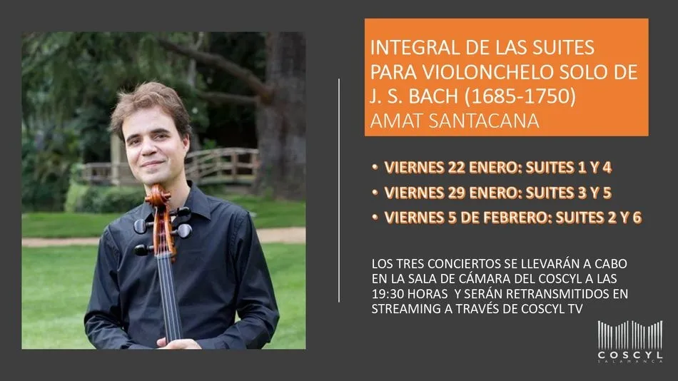 El Conservatorio Superior de Música de Castilla y León ofrecerá a partir del 22 de enero tres conciertos a cargo del violonchelista catalán Amat Santacana. Estas tres citas se centrarán en la obra del conocido compositor Johan Sebastian Bach y sus Suites para violonchelo. Los conciertos serán retransmitido en streaming a través de COSCYL TV
