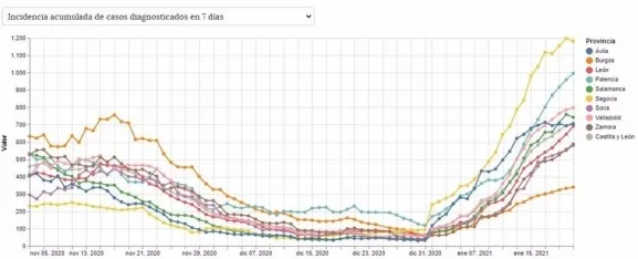 La provincia de Segovia sigue con la máxima incidencia de la Comunidad, ya por encima de los 2.000 casos por cada 100.000 habitantes a 14 días --2.039-- y esos 1.181 a 7 días, que es el indicador en el que más se fija actualmente la Junta de Castilla y León para determinar las medidas sanitarias.
