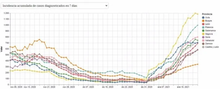 La incidencia acumulada a 14 días aumenta en la última jornada en todas las provincias y en algunas de ellas como León se experimentan subidas de más de 100 puntos, -de 1.482 casos por 100.000 habitantes a 1.609 en Palencia y de 1.033 a 1.148 en León-, si bien este incremento puede ser un efecto estadístico derivado de que ya no entran en la serie de 14 días los datos notificados el 7 de enero, jornada posterior al festivo día de Reyes en el que la realización de pruebas fue mucho menor que un día laborable.