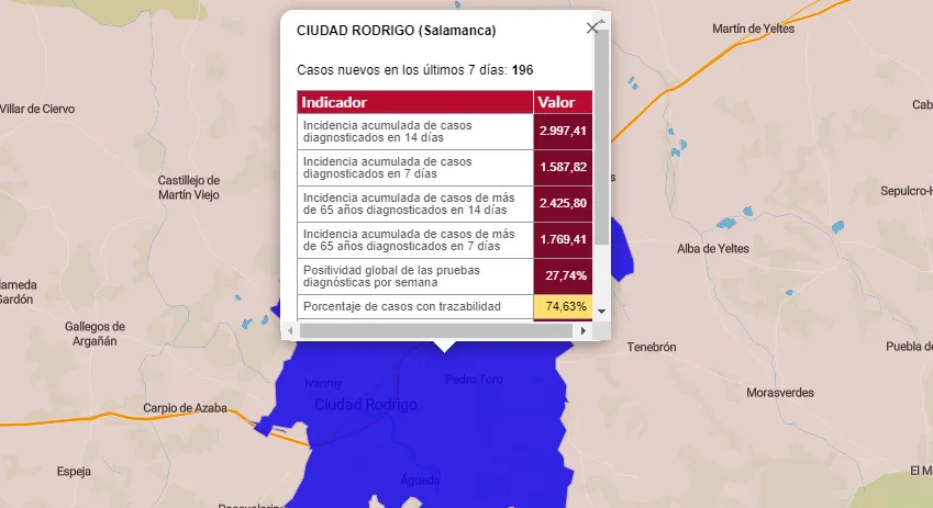 Atendiendo a la forma habitual de medir la incidencia, Ciudad Rodrigo acumula 1.587 casos por cada 100.000 habitantes (un poco menos que el viernes, cuando era de 1.628 casos) en la última semana; y 2.997 casos por cada 100.000 habitantes en las últimas dos semanas (el viernes este dato era de 2.835 casos). Hay que recordar que, de los grandes municipios de la provincia, sólo Guijuelo tiene peores datos.