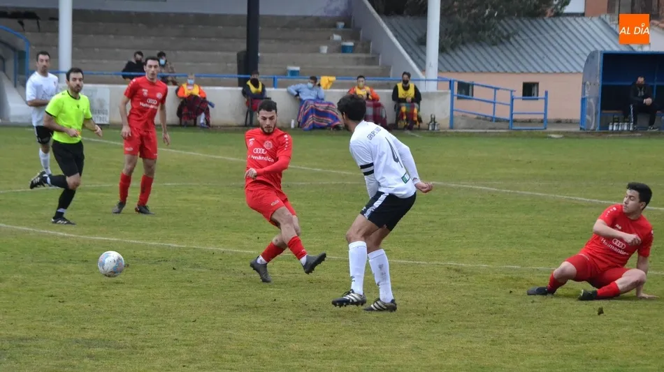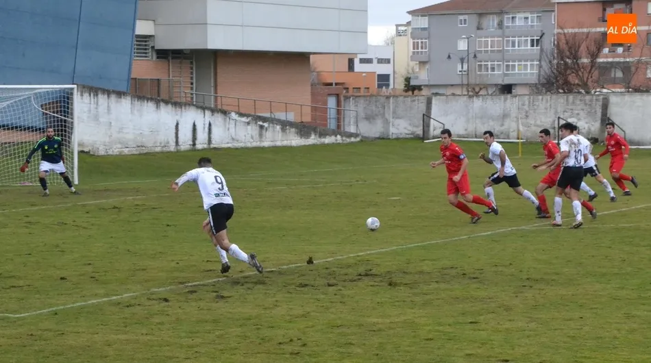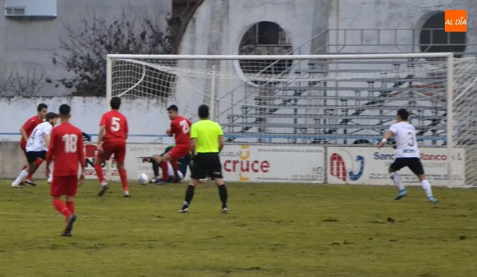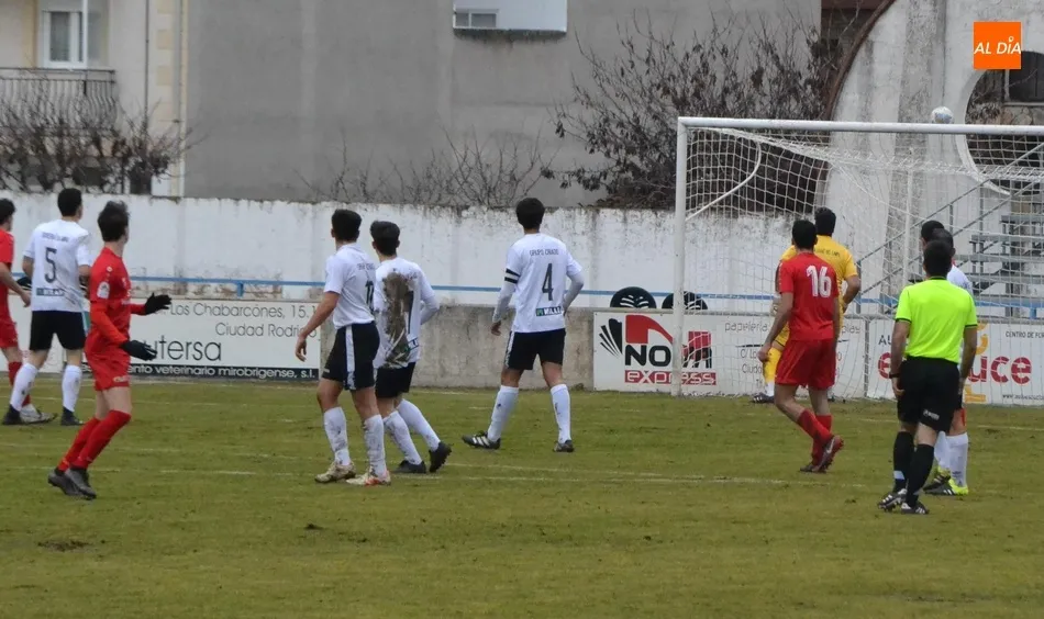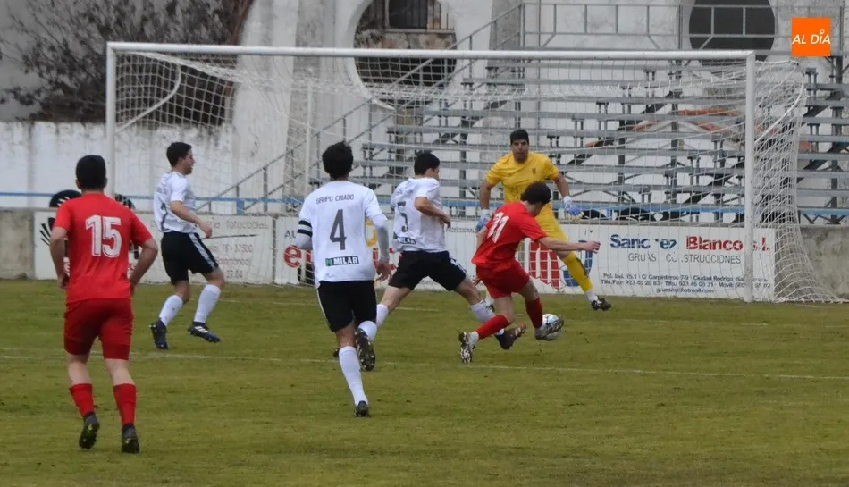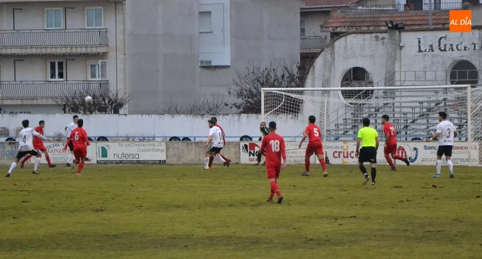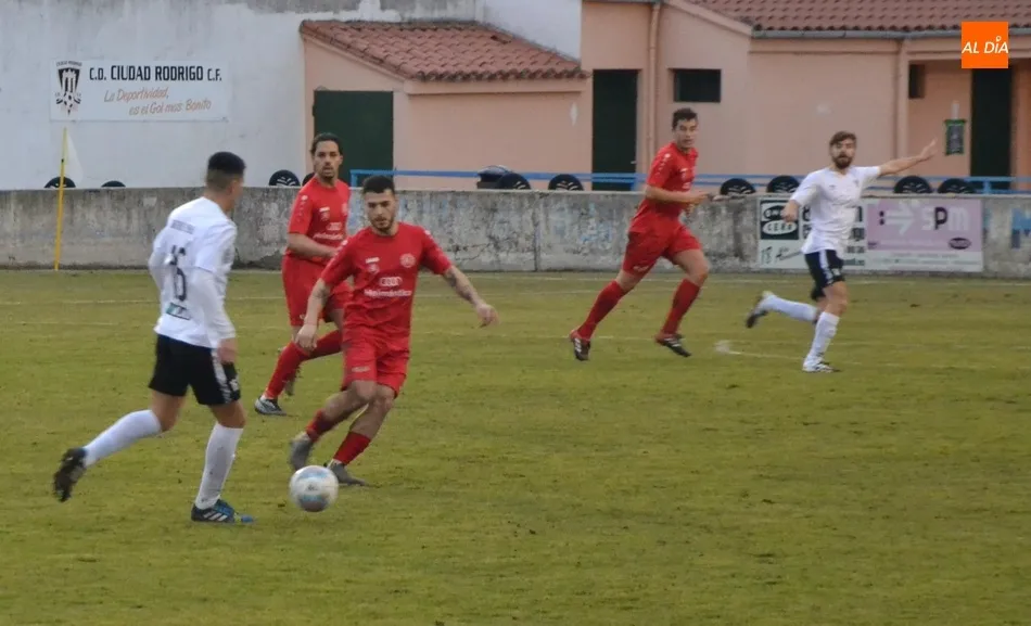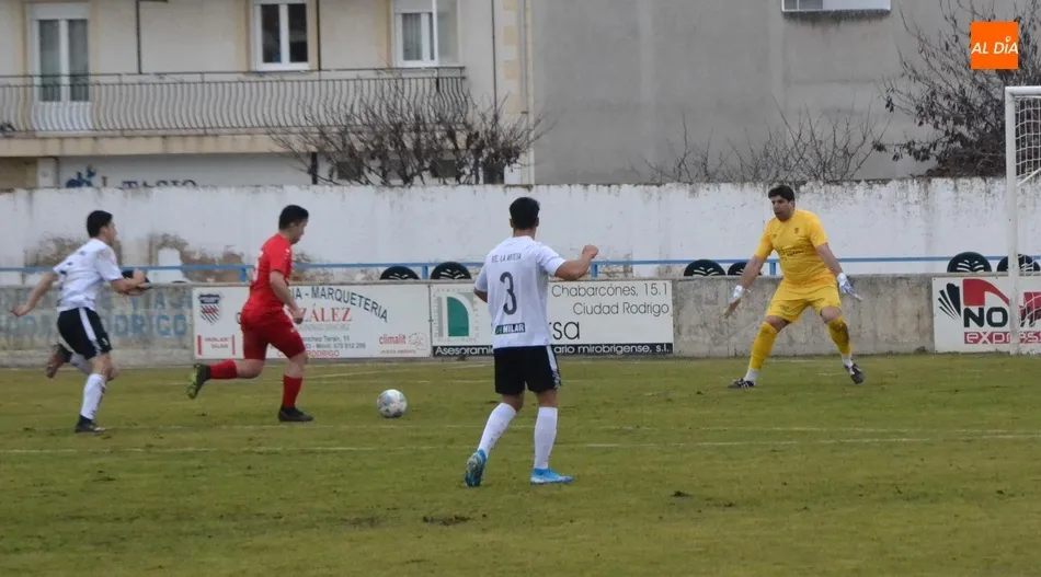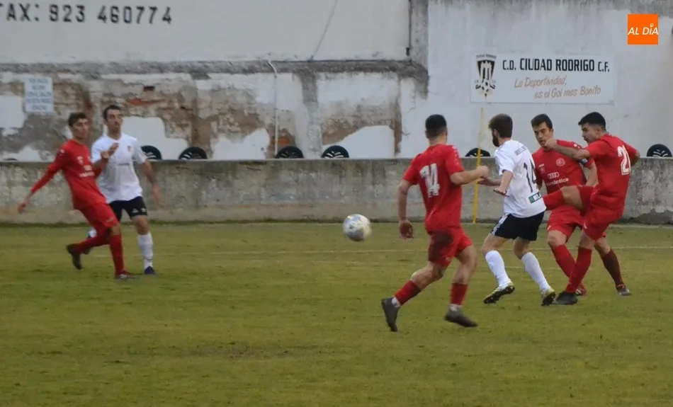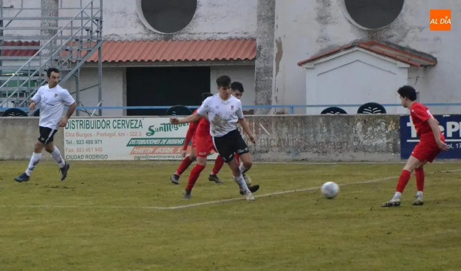Pese a ese dominio, al Ciudad Rodrigo le costó un poco, hasta el 53?, empezar a probar suerte, con una falta de Alberto García que se marchó al lado del palo izquierdo. Poco después hubo una jugada con un triple remate consecutivo (de Alberto García, Alberto Martín y Pablo López) que acabó en córner, en cuyo saque hubo un remate de cabeza que se estrelló en el larguero.
