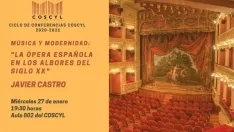 Esta semana continuamos con el ciclo de conferencias del COSCYL 2020-2021 con el profesor Javier Castro como protagonista. En concreto, y dentro de la temática general de música y modernidad, otorgará una charla sobre ?La ópera española en los albores del siglo XX?. Se llevará a cabo el miércoles 27 de enero a las 19:30 horas en el Aula 002 del COSCYL y será retransmitido en streaming a través del canal COSCYL TV.