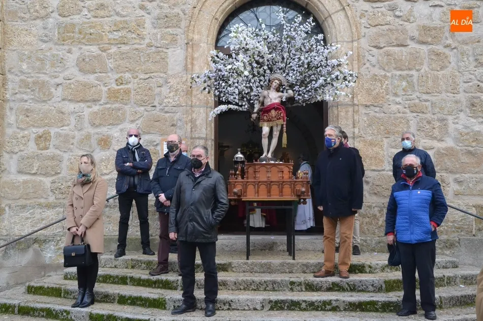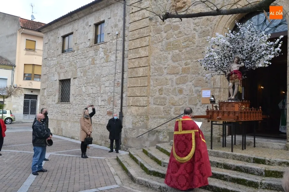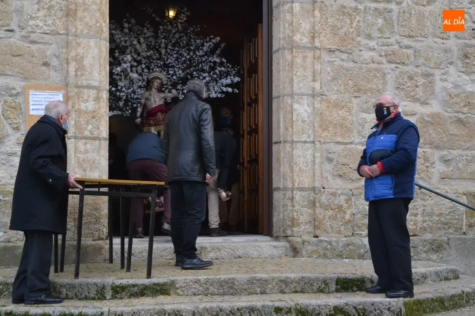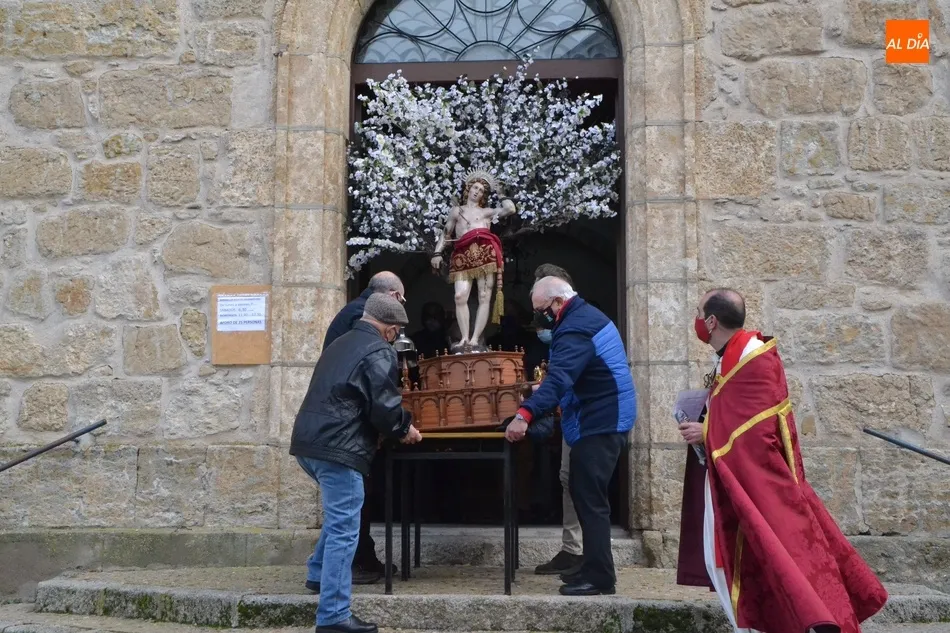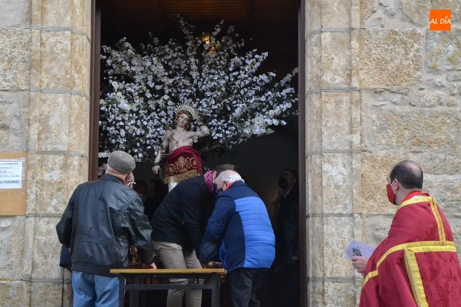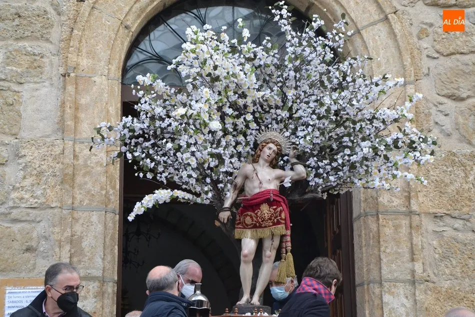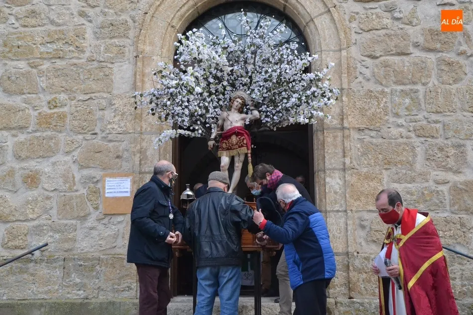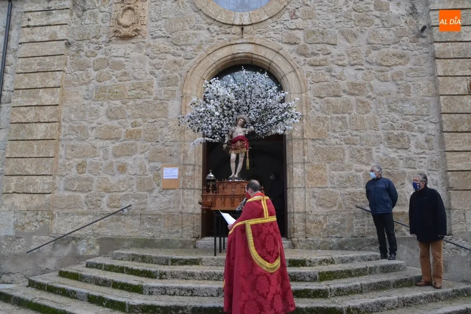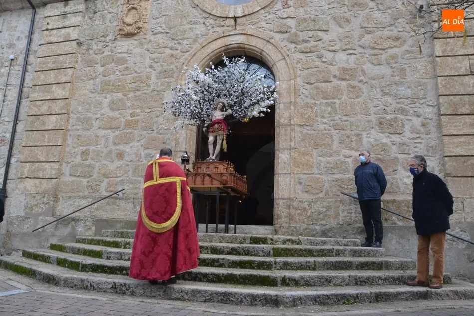 Ese acto a las puertas consistió en la lectura de una oración de súplica a San Sebastián por parte del párroco de San Cristóbal, Rafael Caño, quién expresamente mencionó que ?suplicamos ser fortalecidos en este tiempo de pandemia y ser liberados del coronavirus; que los enfermos y sus familiares sean reconfortados y los difuntos acogidos en la casa celestial?. Tras ello hubo una ronda de aplausos y una serie de vivas, a San Sebastián, San Cristóbal, Ciudad Rodrigo y España por parte de Joaquín Sánchez ?Tato Galerías?, antes de introducir de nuevo en el templo la imagen, con algo de dificultad (hubo que bajarla casi a ras de suelo), ya que este año el ramo que se le ha colocado a modo de ?ramas? ha sido bastante generoso.