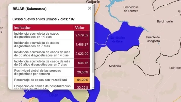 La Incidencia acumulada en 14 días en Béjar asciende hasta 2.579?82 por cada 100.000 habitantes