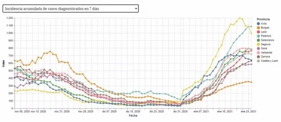 La incidencia acumulada del COVID-19 a siete días ha bajado por primera vez en una jornada desde el pasado 30 de diciembre, al pasar de 729 casos por cada 100.000 habitantes en los datos actualizados este domingo --que computan los positivos notificados hasta el sábado-- a los 719 casos por cada 100.000, y con caídas en cinco de las provincias -Ávila, Burgos, Salamanca, Segovia y Valladolid-.