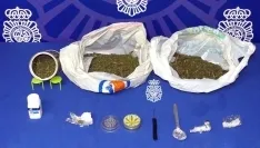 Posteriormente, los agentes encontraron dos bolsas de plástico con asas que contenían en su interior una sustancia vegetal de color verdoso, al parecer marihuana, con un peso de 500 gramos. También recogieron un bote que contenía en su interior la misma sustancia que había en las bolsas, un grinder transparente con el logo de una hoja de marihuana, y un tarro de pastillas de tranquimazin con un líquido blanco transparente en su interior, con olor a amoniaco.