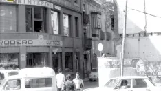 En esta foto, además, se puede ver que ?ya había sido derribado el edificio de esquina con Juan del Rey, aunque luego se tardó bastante en edificar. Se obseva también el tradicional comercio de Rodero, desaparecido hace pocos meses y el cartel de la conocida Pensión Moro, el anuncio de la también desaparecida peluquería Monzón y el anuncio de una actuación del dúo los Amaya?, explica Blázquez.
