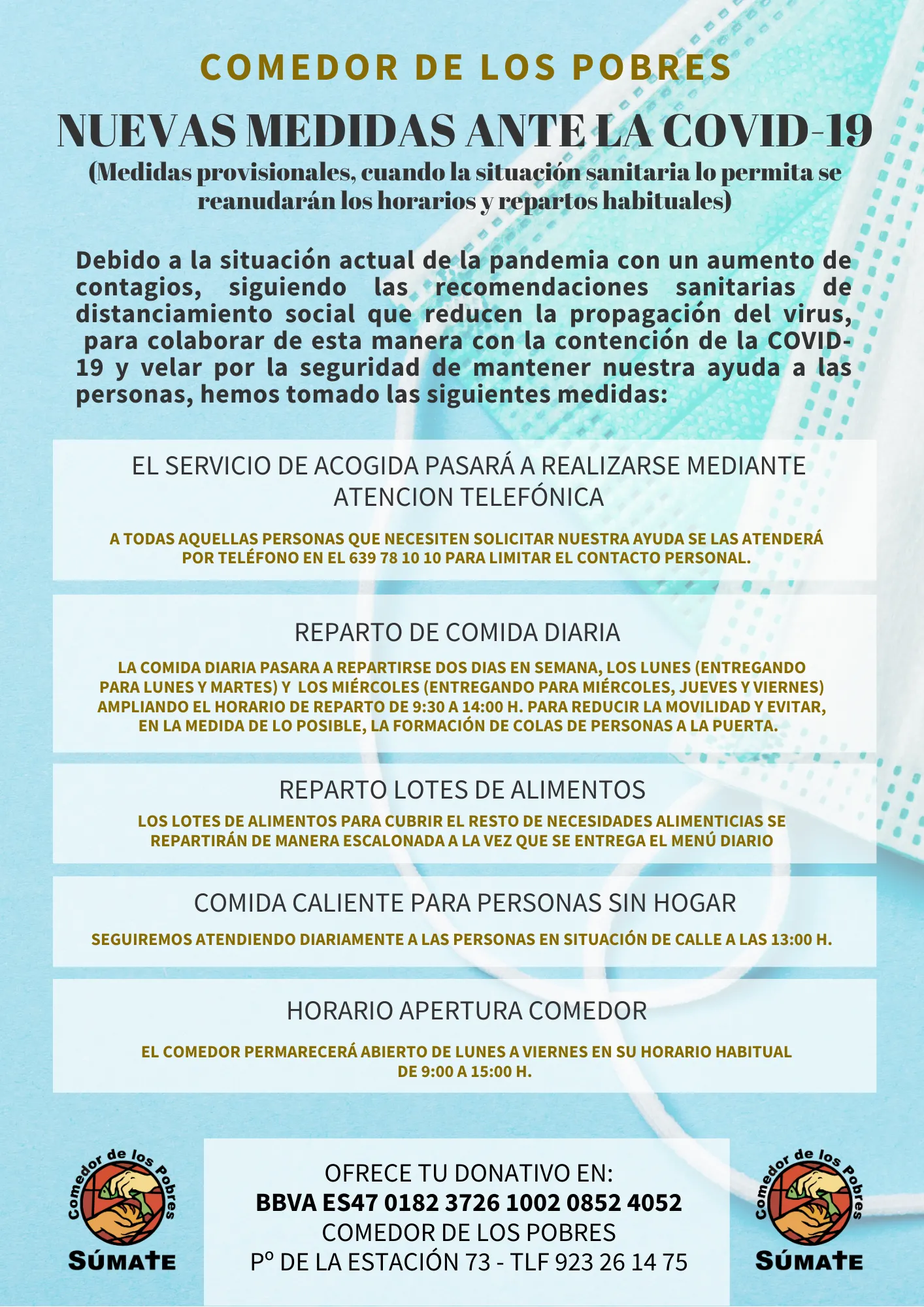 El Comedor de los Pobres ha reorganizado su actividad con el fin de potenciar las medidas de prevención frente al coronavirus. Así, el servicio de acogida será telefónico, el reparto de comida se concentrará los lunes y miércoles y se escalonará la distribución de lotes de alimentos.