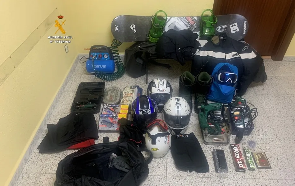 Según explica la Guardia Civil en una nota de prensa, los hechos delictivos tuvieron lugar en la madrugada del viernes 29 al sábado 30, cuando se registraron hasta 21 robos con fuerza en trasteros de la citada comunidad de vecinos (además de otros tres delitos relacionados de hurto, daño y robo de uso de vehículo a motor), sustrayéndose numerosos efectos, como herramientas, equipos y ropa para la nieve, cascos, y hasta una motocicleta.