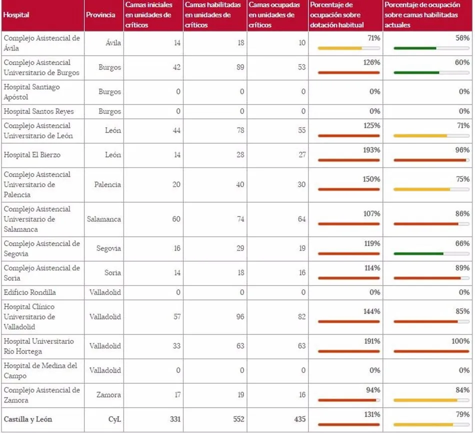 Los hospitales de Castilla y León tienen a fecha de este jueves 435 pacientes en las unidades de críticos -324 de ellos con COVID-19-, con lo que la gran mayoría de ellos -Burgos, El Bierzo, León, Palencia, Salamanca, Segovia, Soria y los dos de Valladolid- ven superada la capacidad que tenían en sus UCI antes de la pandemia del coronavirus.