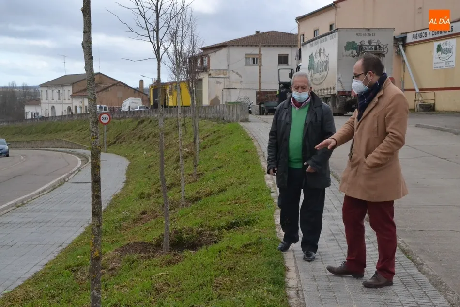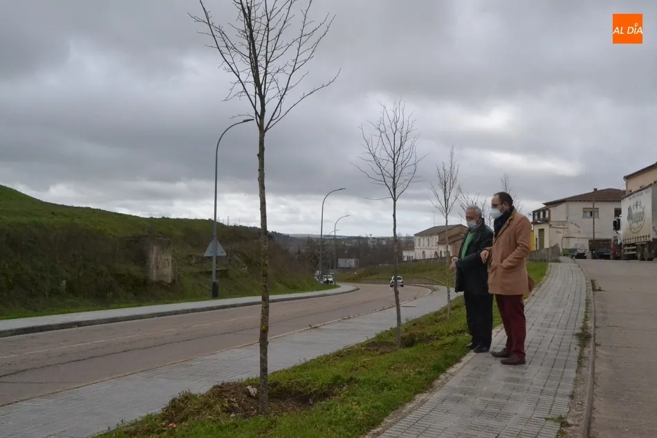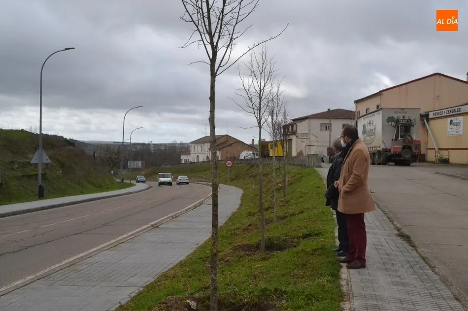 La entrada al núcleo urbano de Ciudad Rodrigo por la Avenida de Portugal ha incorporado en el talud del tramo comprendido entre las intersecciones de la Avenida con las Tenerías y con el cruce de Ivanrey un total de 63 nuevos árboles, todos ellos tilos, que en la mañana del lunes fueron visitados de cerca por el alcalde Marcos Iglesias y el delegado de Parques y Jardines, José Manuel Jerez.