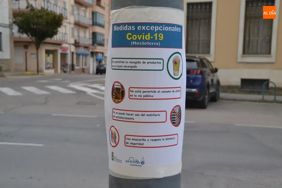 La Policía Local de Ciudad Rodrigo ha colocado carteles a las puertas o en las inmediaciones de los establecimientos de hostelería de la ciudad que siguen funcionando en estos momentos en los cuales se recoge el ?protocolo? que debe seguir el servicio de recogida de alimentos y bebidas por parte de clientes, el único permitido desde el domingo tras entrar en vigor las medidas de carácter ?excepcionalísimo? para contener la pandemia del coronavirus.