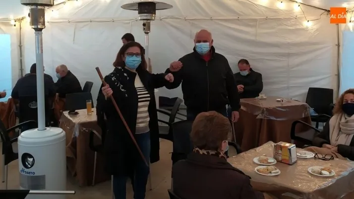 La terraza de una cafetería de Hinojosa de Duero ha acogido esta tarde la entrega del bastón de mando, el acto más tradicional de la celebración del día de Santa Águeda. José Francisco Bautista, alcalde de la localidad, hizo entrega del bastón a María Teresa Francho, la alcaldesa del año 2021, ante la presencia de un reducido número de mujeres. La peculiar celebración se cerró con un café y ricas pastas de Hinojosa.