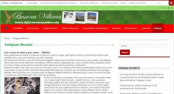 Ahora estamos inmersos en el reto que supone "competir", sobre todo, con las redes sociales. Nos aplicamos el dicho de que, si no puedes con tu enemigo, únete a él, y ahí estamos, en Facebook, Instagram y Twitter junto con nuestra web intentando llegar al mayor número de usuarios posibles y seguir siendo el referente para todas los villorejos. Por otra parte, nuestra última novedad fue la inclusión dentro de la página Besana Villoria de una recopilación completa de las antiguas revistas de Besana editadas en papel y digitalizadas en formato Pdf, para que todo el mundo pudiera disfrutar de ellas ya que no todos las tienen físicamente. De esta manera, hemos podido recuperarlas y ya se puede acceder a ellas. Son un claro ejemplo del gran trabajo llevado a cabo por un importante grupo de colaboradores a nivel particular, de asociaciones e instituciones, algo que en la presente etapa cada vez nos está costando más conseguir.