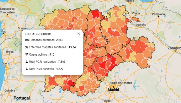 Por último, en el municipio de Ciudad Rodrigo no se puede precisar si ha habido nuevos positivos en las últimas horas, ya que su incidencia sigue bajando al cumplir ciertas antigüedades bastantes casos. La quincenal pasa de 2.691 a 2.373 casos por cada 100.000 habitantes, y la semanal, de 603 a 440 casos por cada 100.000 habitantes, lo que equivale en números absolutos a 54 positivos en la última semana y 291 en las últimas dos.